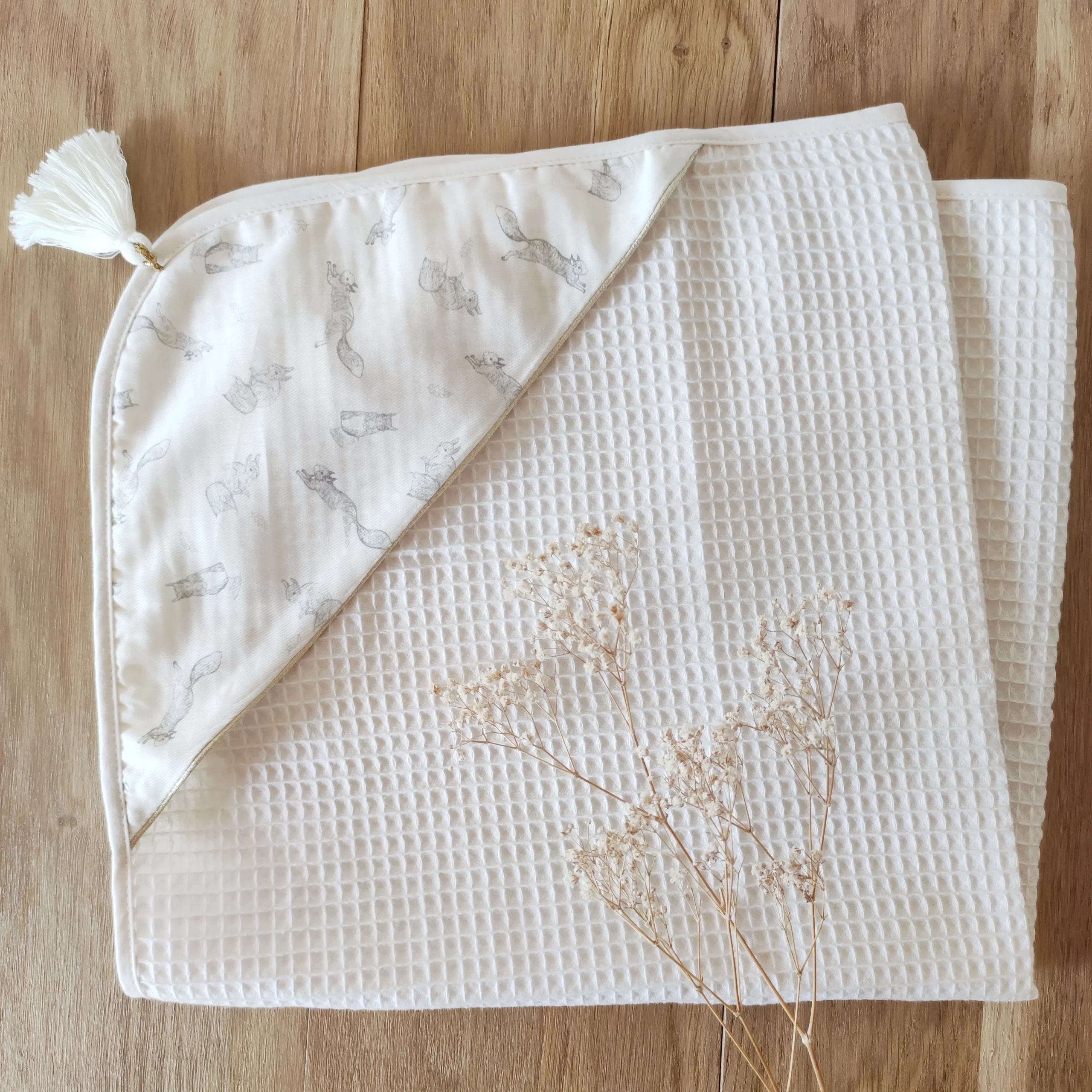 Cape de bain bébé « Écureuils » gris en coton BIO éponge nid d’abeille écru – Edition limitée