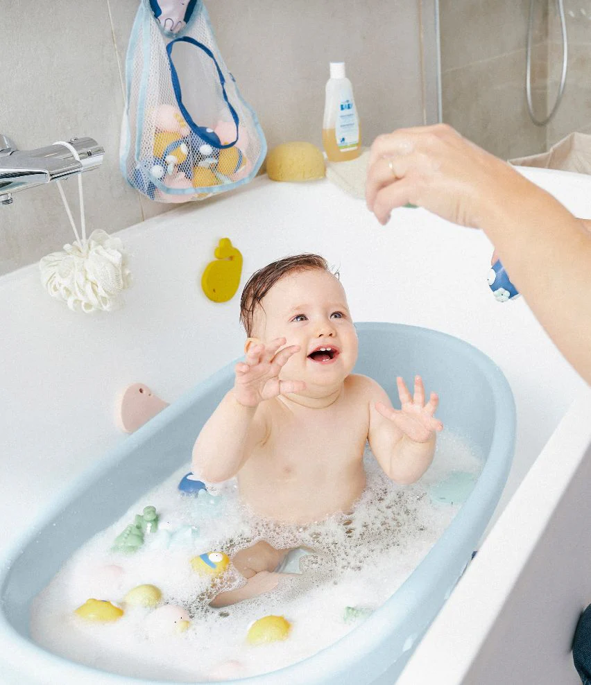 Bébé peut prendre son bain confortablement installé dans son siège de bain ou hamac de bain et a même la place de jouer avec ses jouets de bain🫧