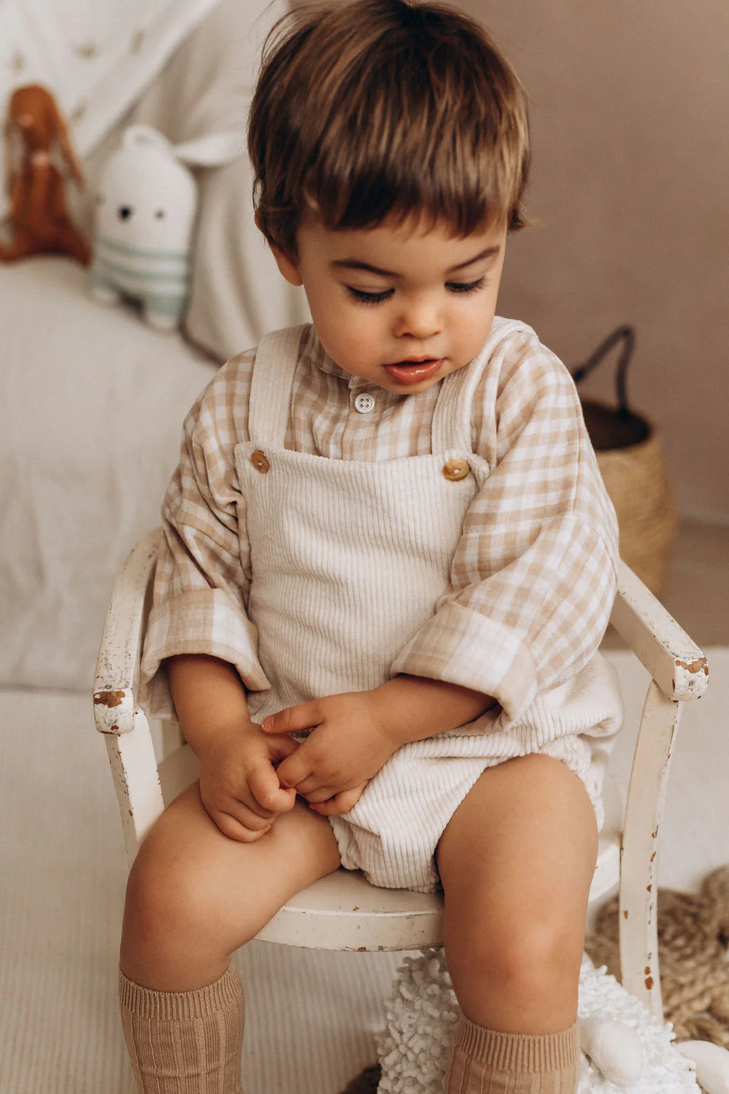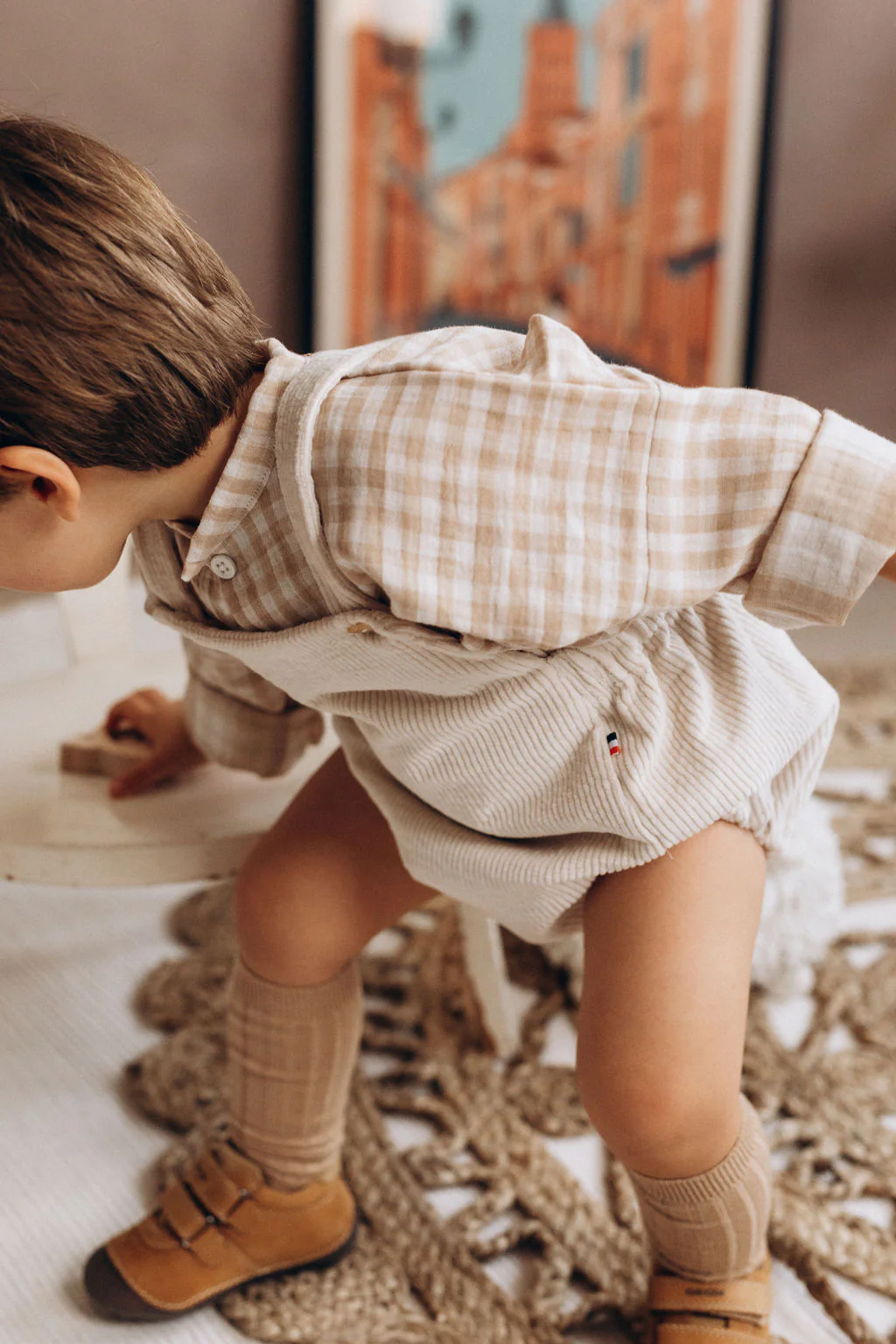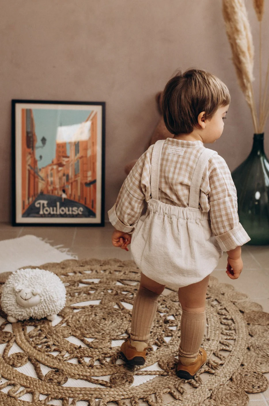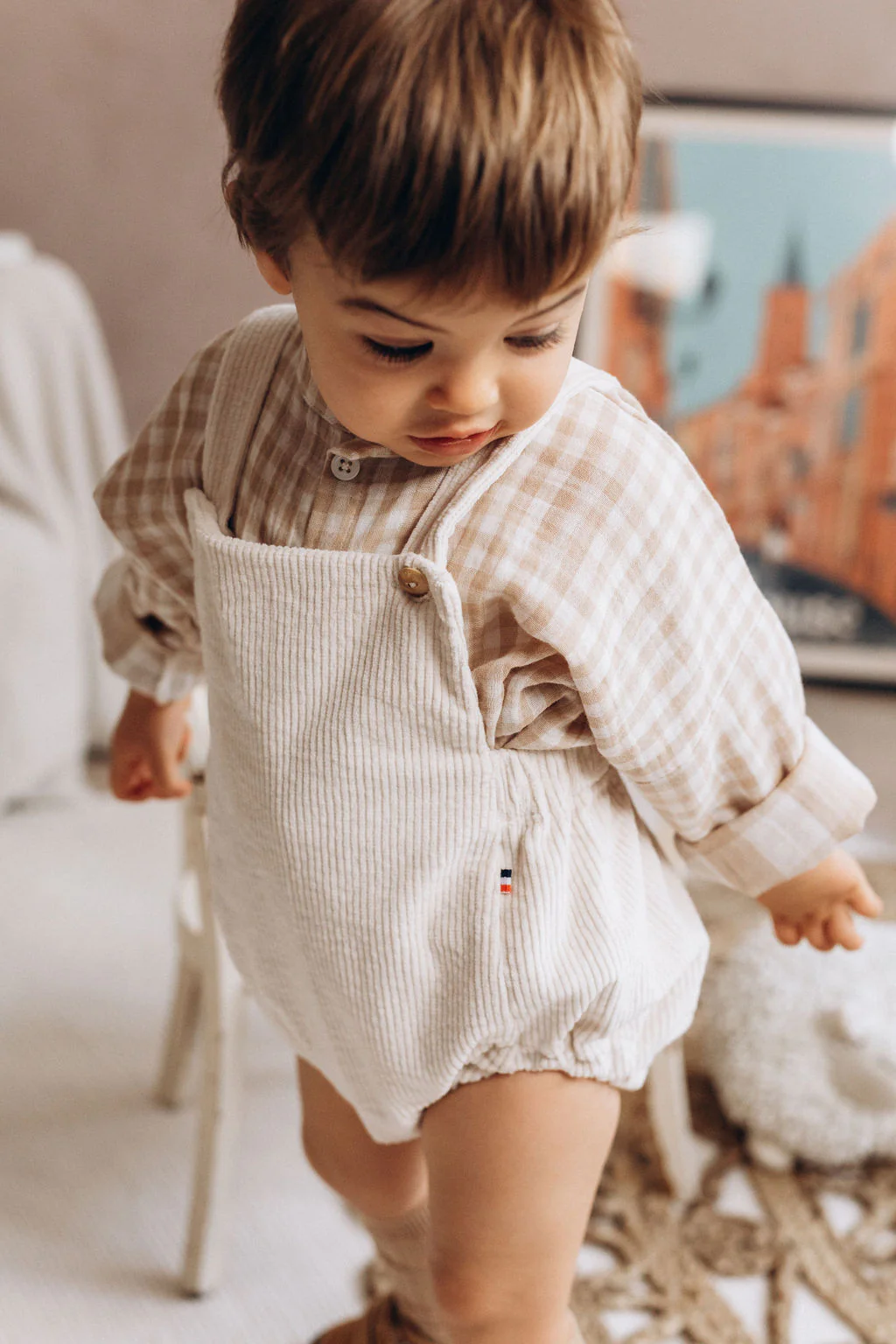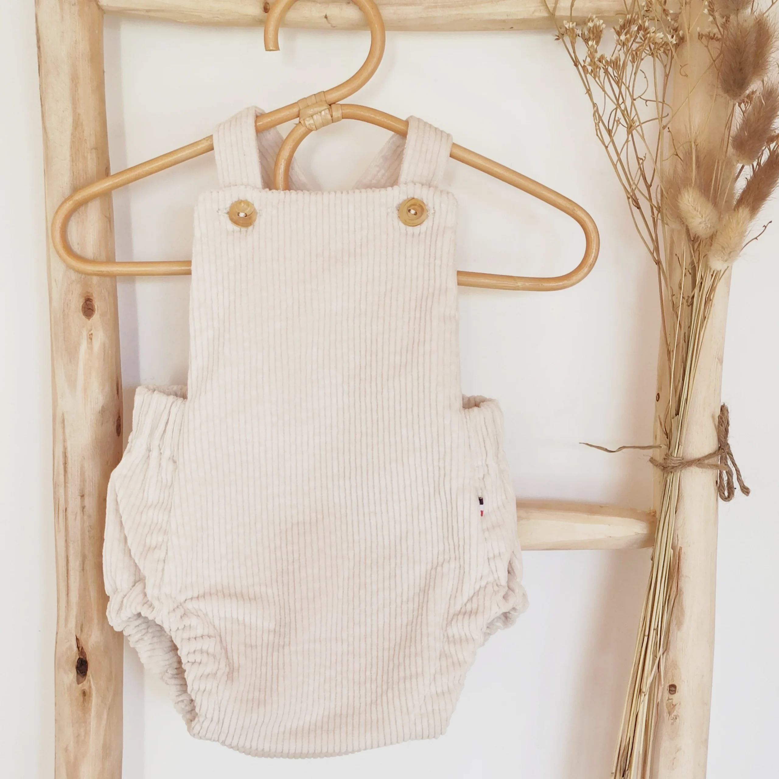 Émerveillez vous à la vue de bébé portant cette ravissante barboteuse à bretelles évolutives en velours côtelé écru fabriquée en France !
