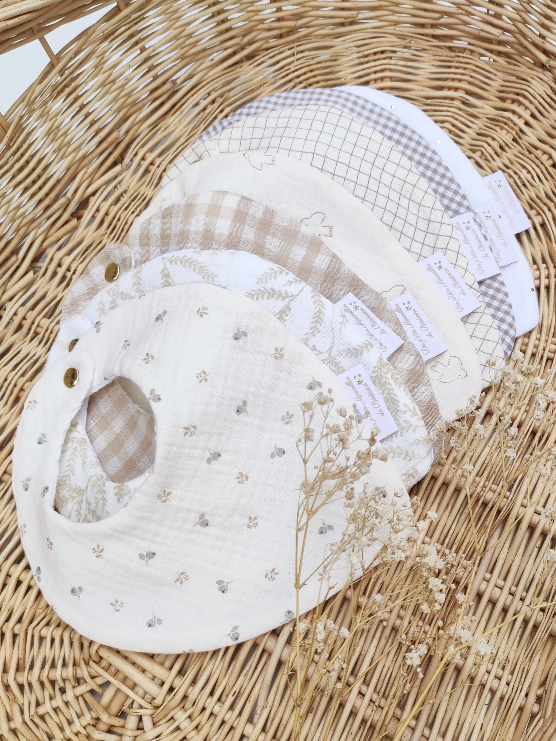 Se ferme par une jolie pression dorée qui apporte une jolie finition à chaque bavoir.