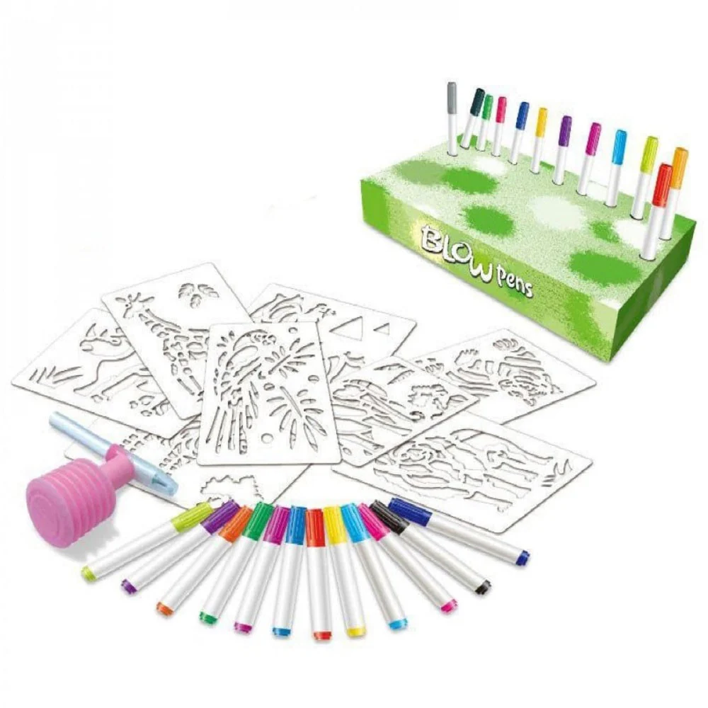 Il suffit qu’il place un pochoir sur une feuille de papier, souffle dans le stylo et voie apparaître sa création. Il peut créer des lignes, des cercles et expérimenter différents effets en ajustant la pression du souffle. Utilisez ensuite les stylos pour ajouter des détails colorés à ses dessins.