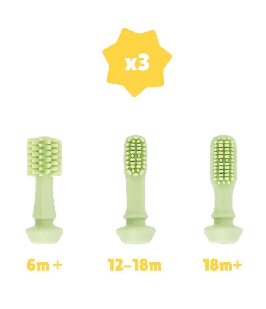 La brosse à dents bébé évolutive en silicone Badabulle accompagne votre enfant de sa première dent jusqu’à ses 3 ans. Dotée de trois embouts interchangeables (6m+, 12-18m+, 18m+), elle s’adapte à chaque étape de la dentition, garantissant une bonne hygiène bucco-dentaire.