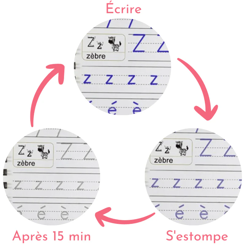 Grâce aux rainures et à l’encre magique qui s’efface seule en quelques minutes, votre enfant se familiarisera instinctivement à reproduire les formes sur ses cahiers de calligraphies autant de fois qu’il le souhaitera.