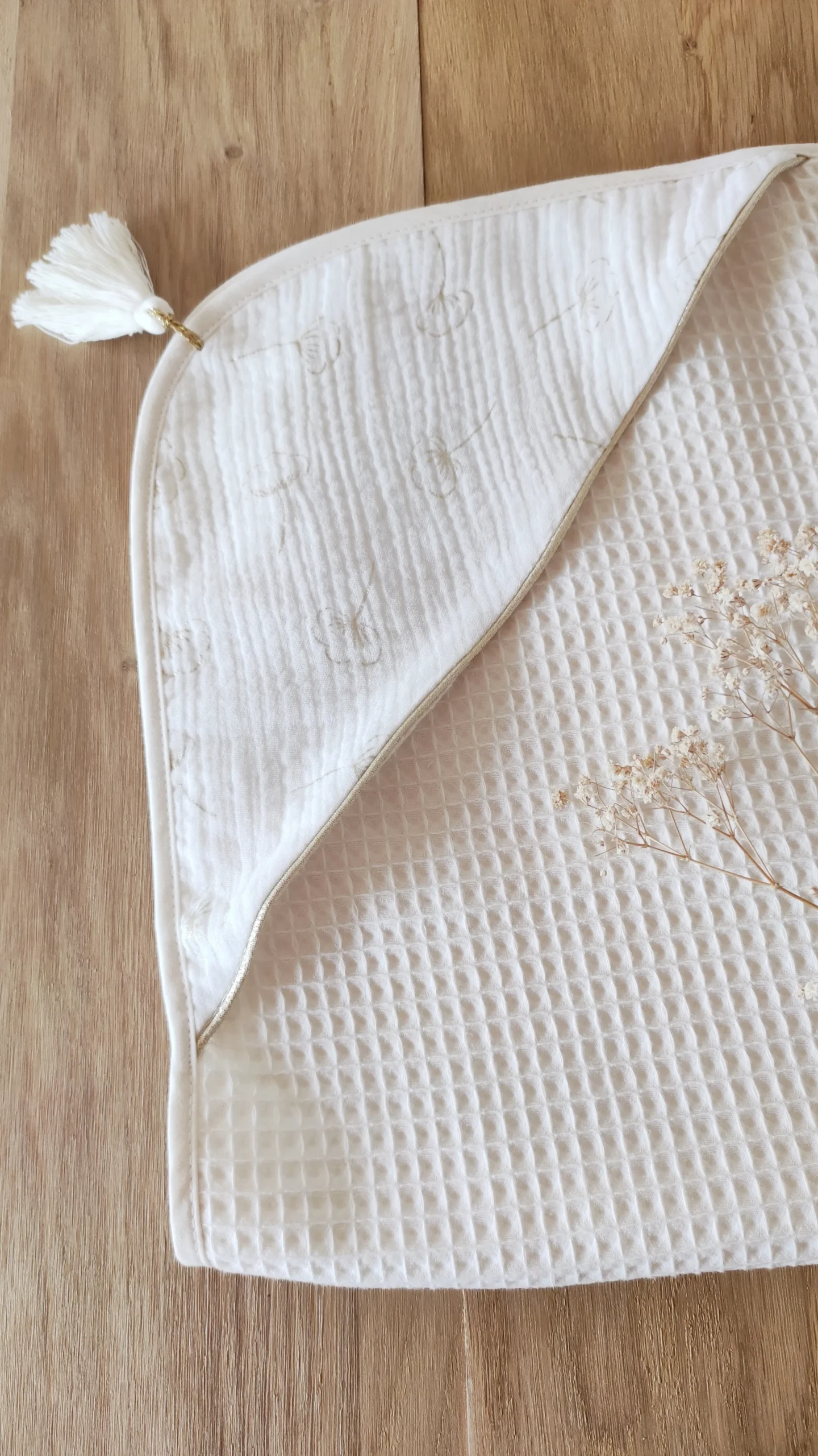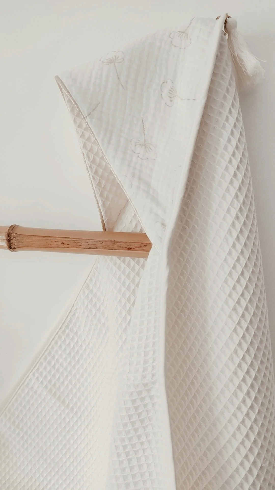 Un magnifique style bohème pour cette très jolie cape de bain en coton éponge nid d’abeille Biologique et double gaze de coton Oeko-Tex.