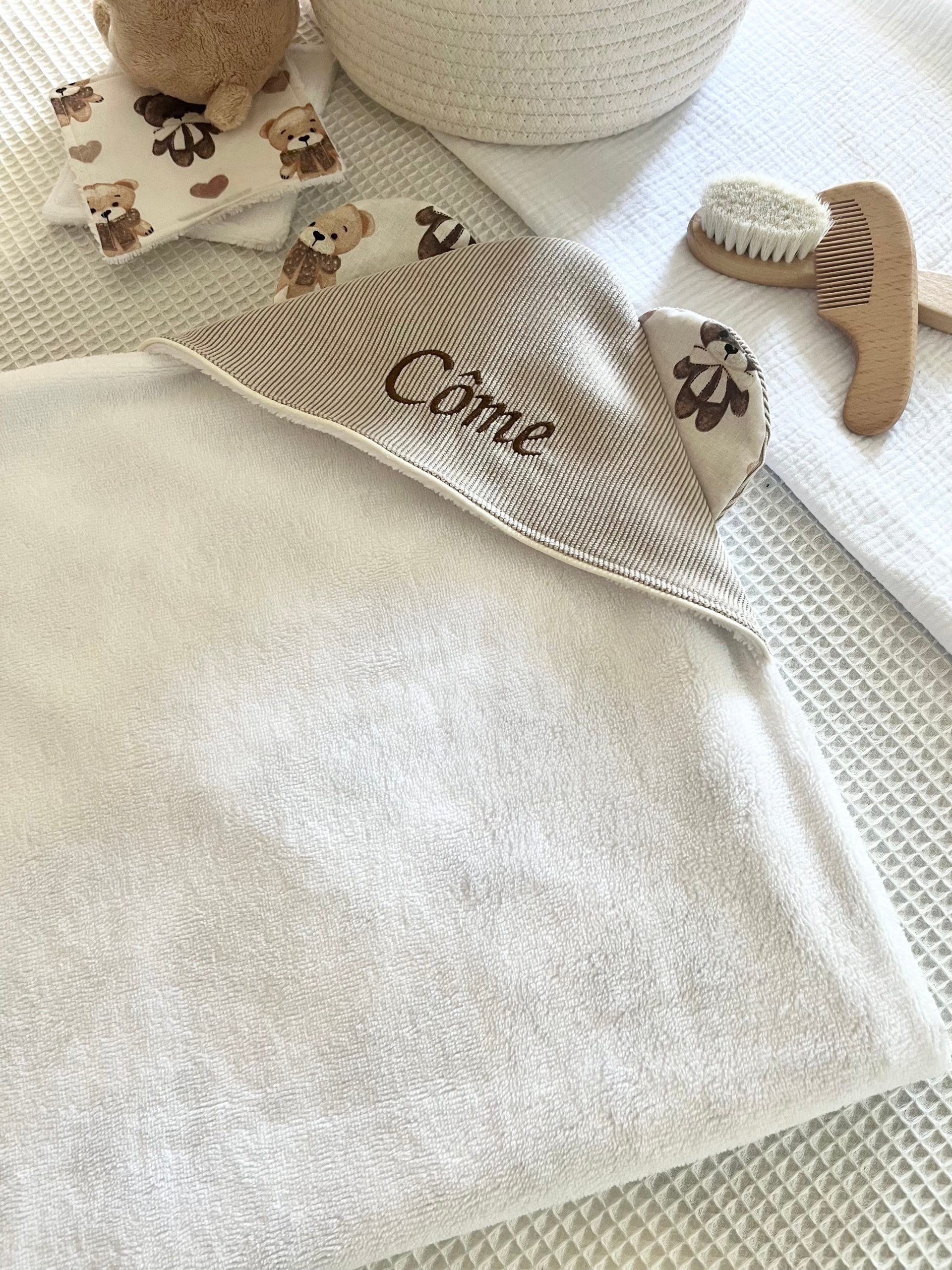 Cape de bain bébé, cape de bain personnalisable, cape de bain éponge de bambou.