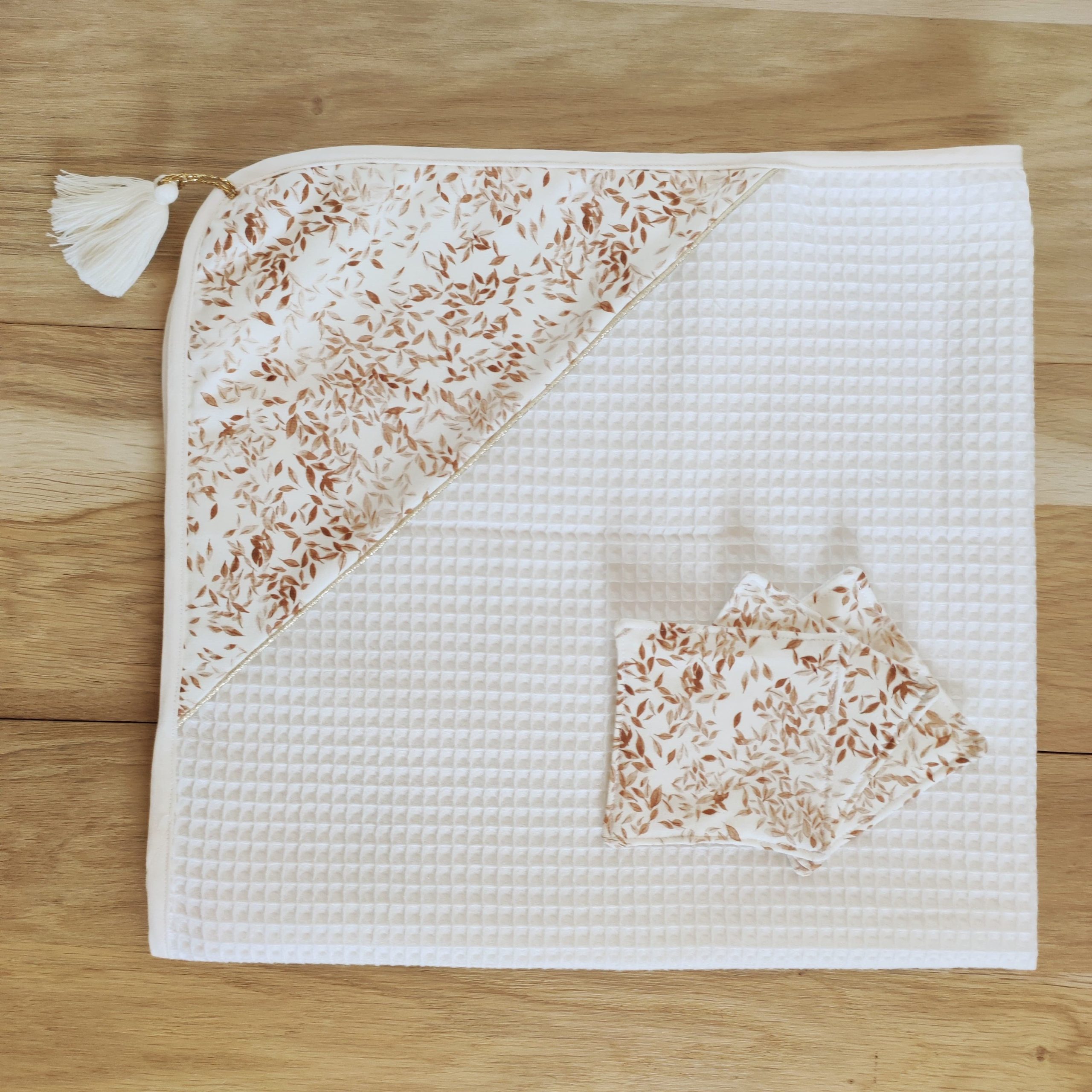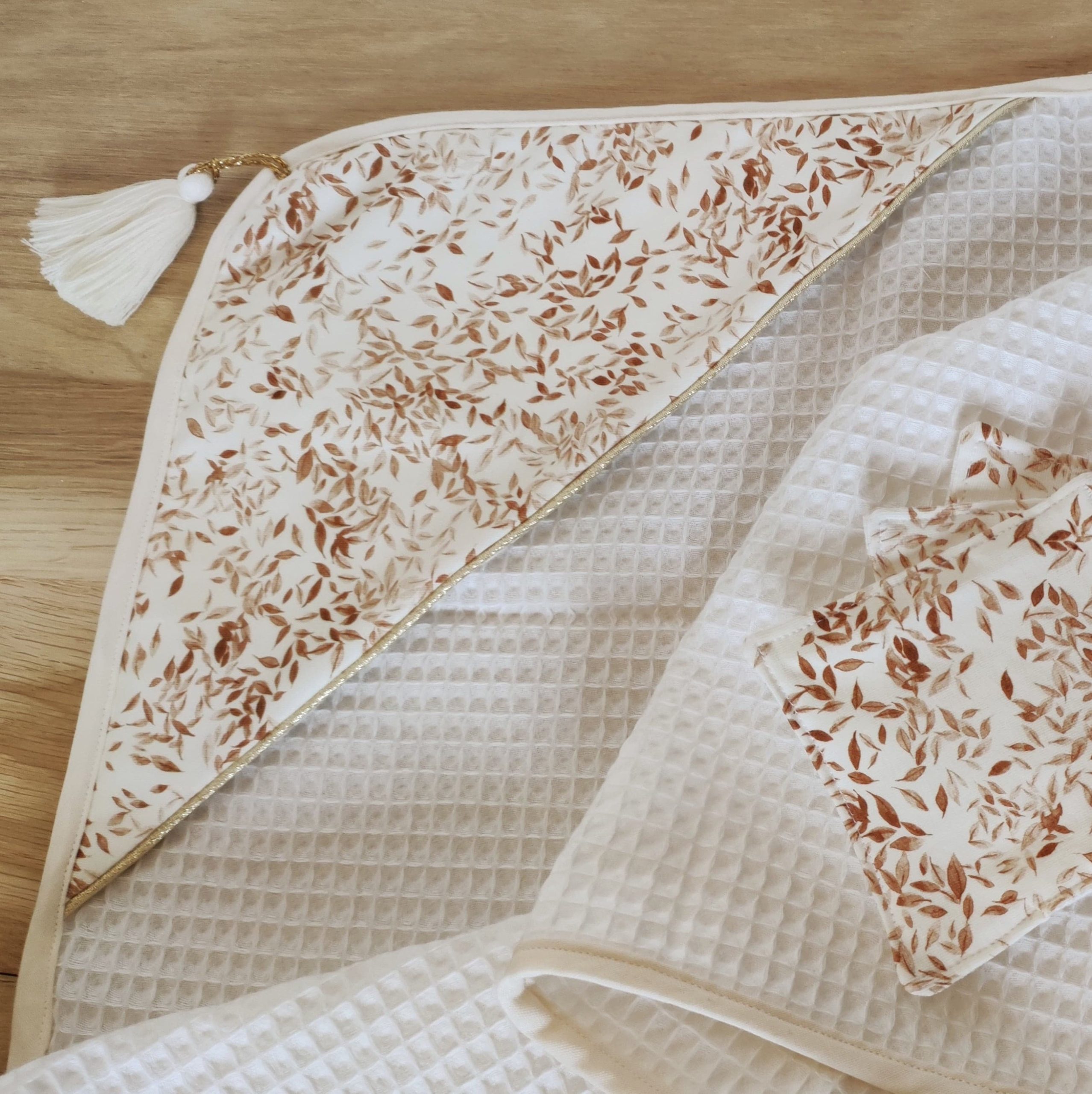 Un magnifique style bohème pour cette très jolie cape de bain en coton éponge nid d’abeille Biologique et coton jersey.