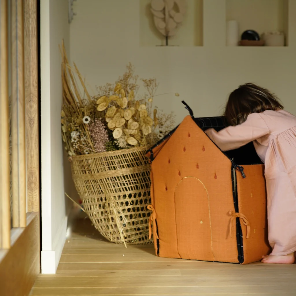Coffre à jouet poétique en gaze de coton, en forme de cabane ou de maison de poupée pour jouer et ranger ses jouets. Elle se plie et se déplie à l’infini comme une marelle pour pouvoir être rangée, transportée et même lavée. On adore son matelassage au fil doré représentant les éléments de la maison et de l’environnement : Fenêtres, escalier, gouttes de pluie et croissant de lune…
