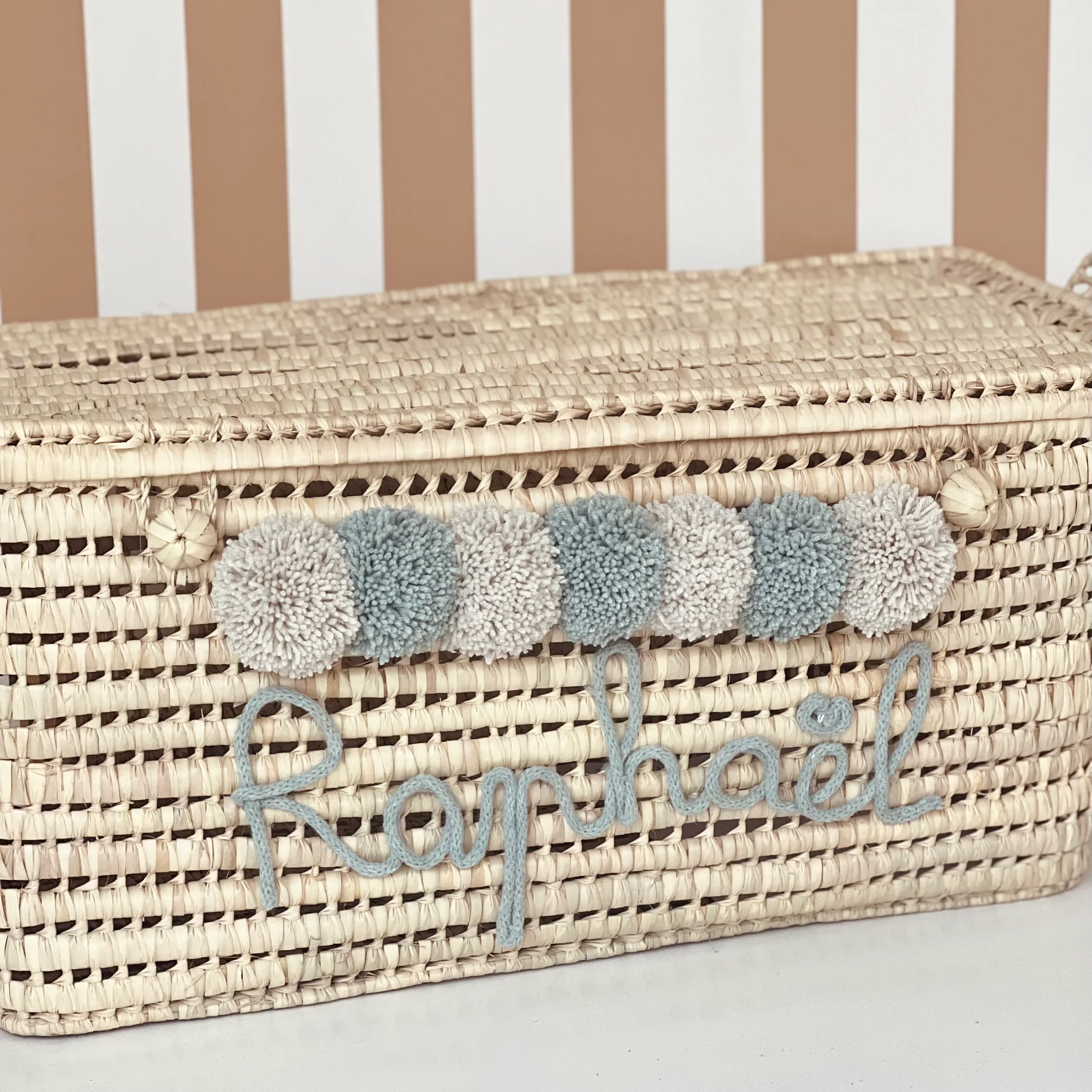 Le nombre de pompons peut varier selon la taille du coffre et l’espace disponible entre les attaches. Généralement Entre 3 et 5 pompons pour les coffres 60cm, et entre 5 et 7 pour les coffres 80cm.