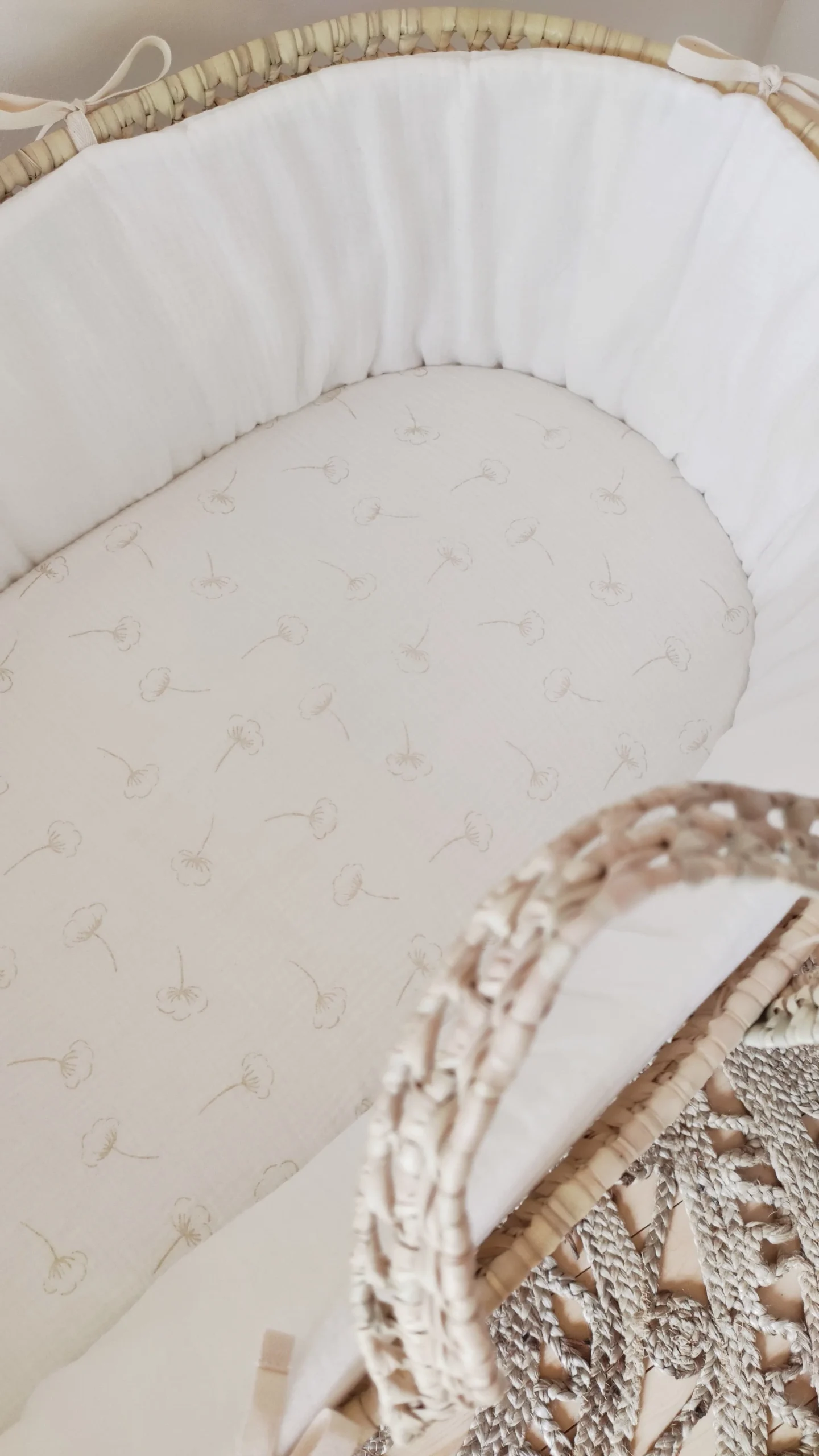 Voici un très joli tour de couffin Fait Main en France en double gaze de coton Biologique blanc cassé qui sera du plus bel effet pour accueillir bébé dans un joli cocon douillet durant ses premiers mois !