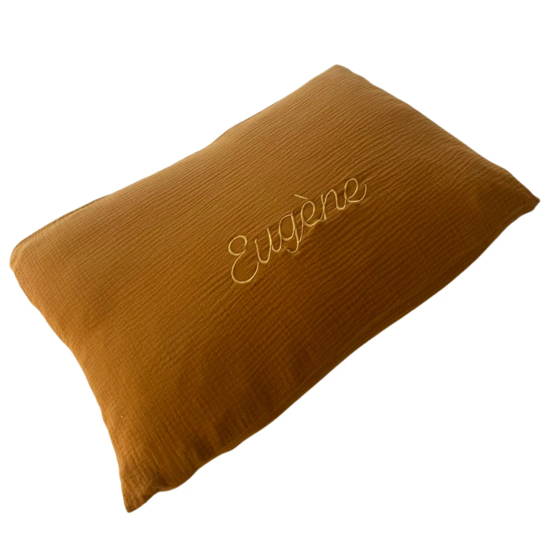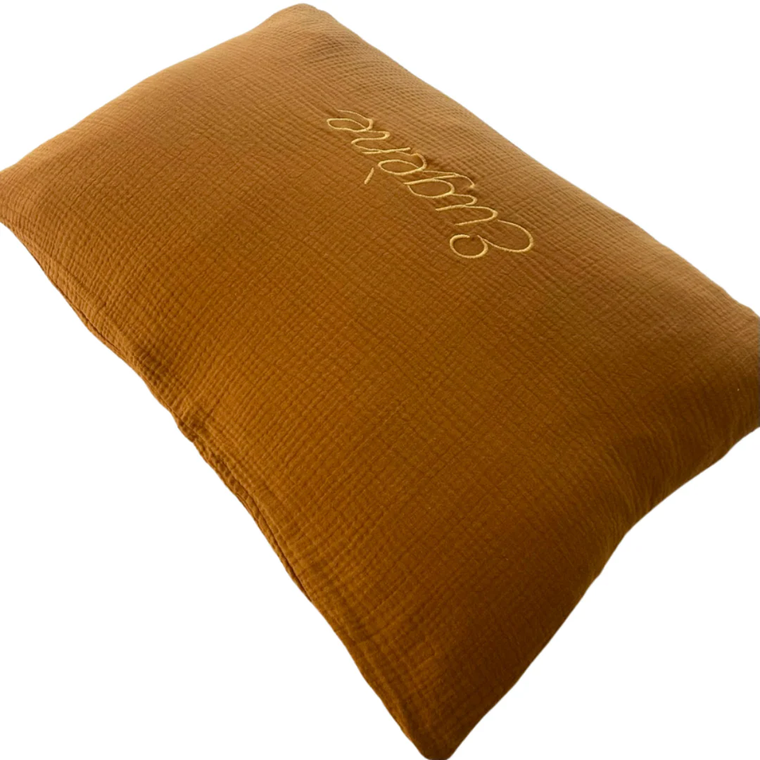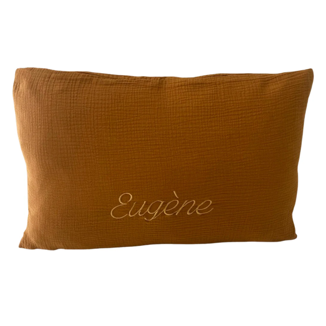 Coussin personnalisé « Eugène » en double gaze de coton. Notre garnissage est également fabriqué en France à Lille.