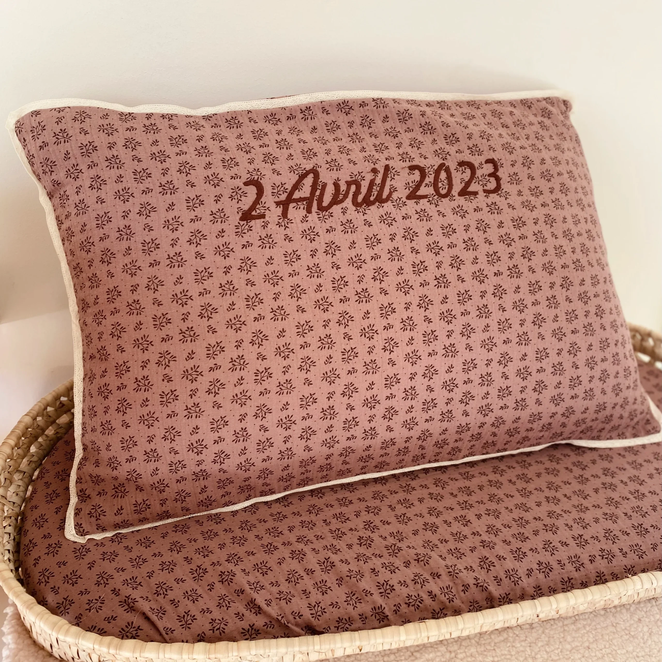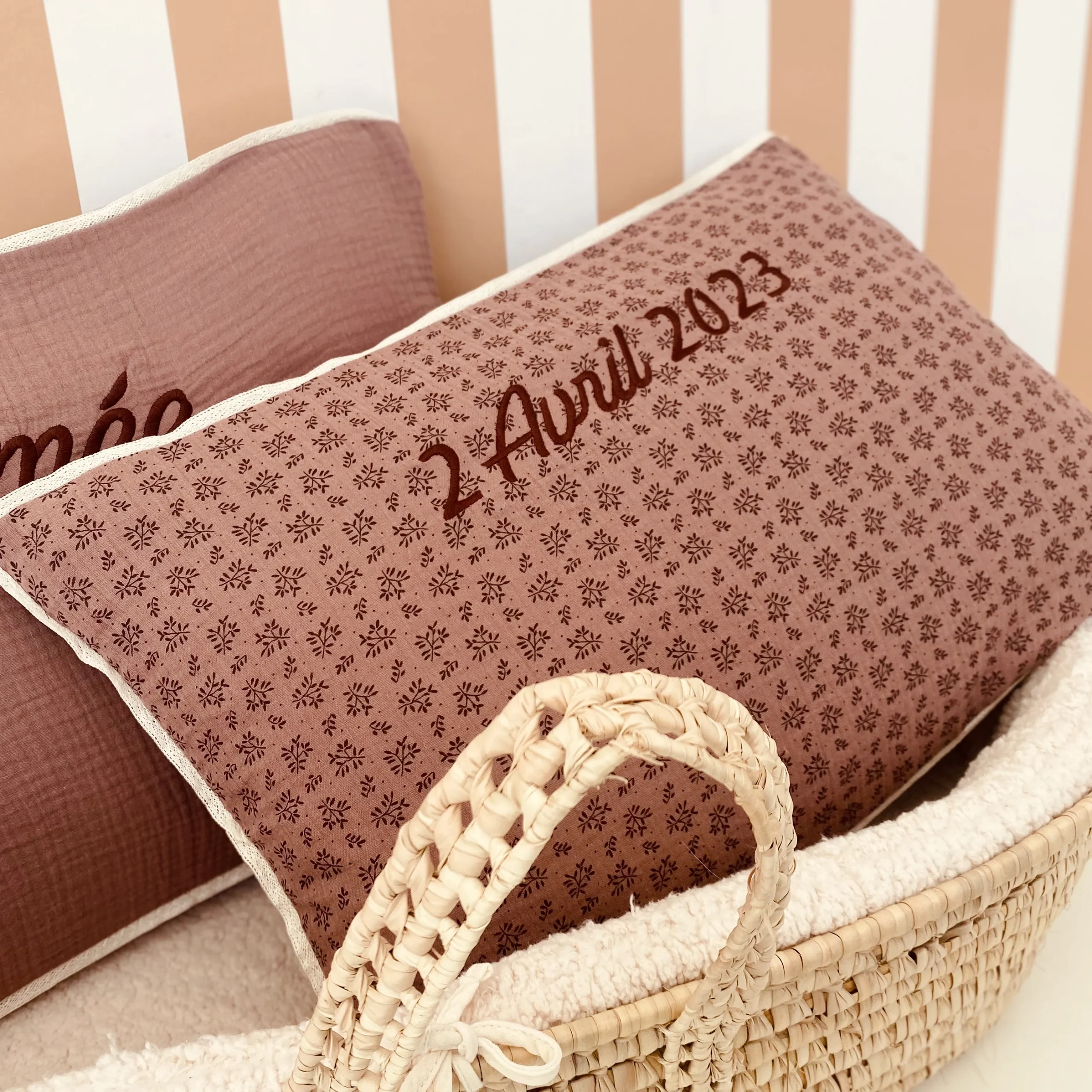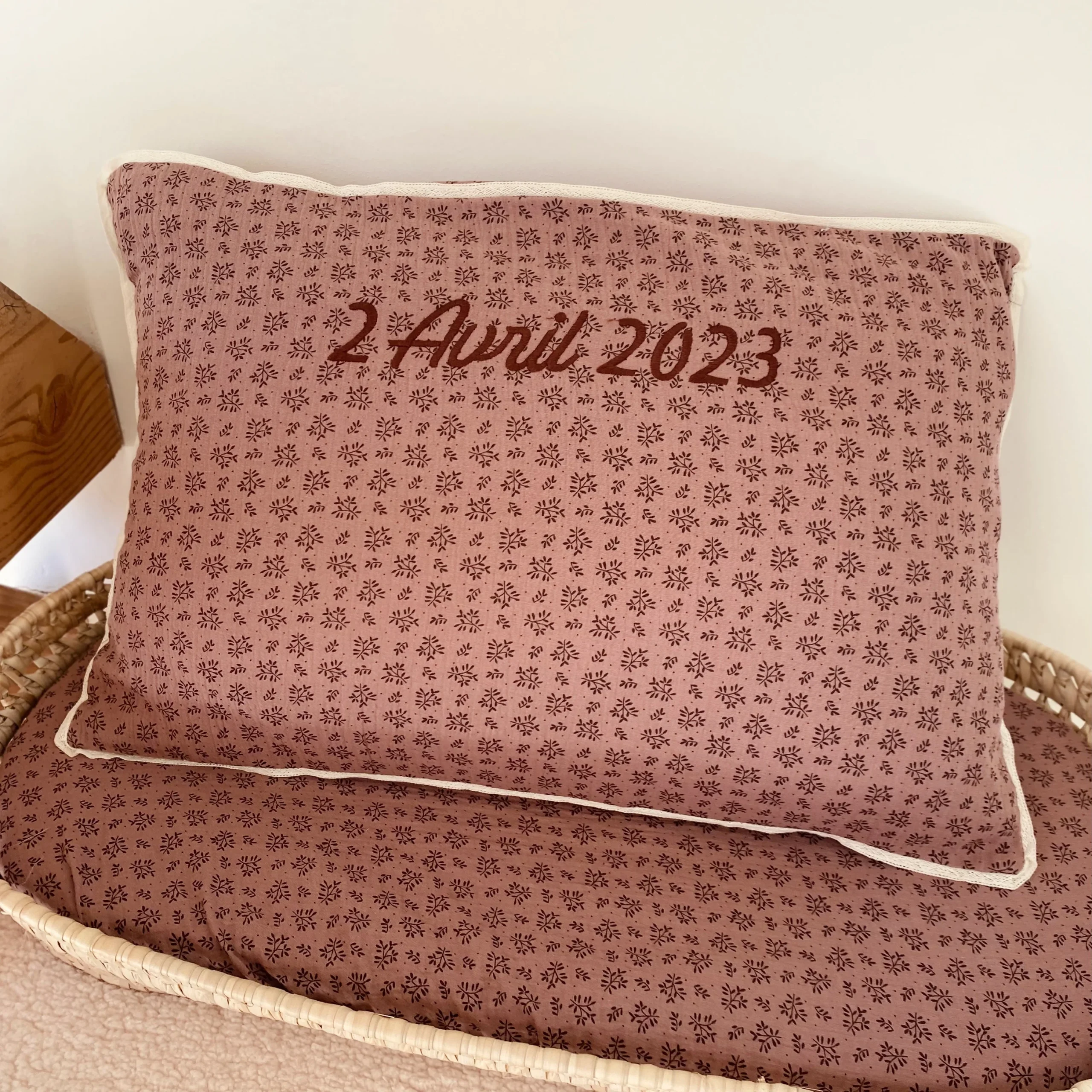 Coussin personnalisé en double gaze de coton, 60x40cm, avec un joli liseré de dentelle. Notre garnissage est également fabriqué en France à Lille