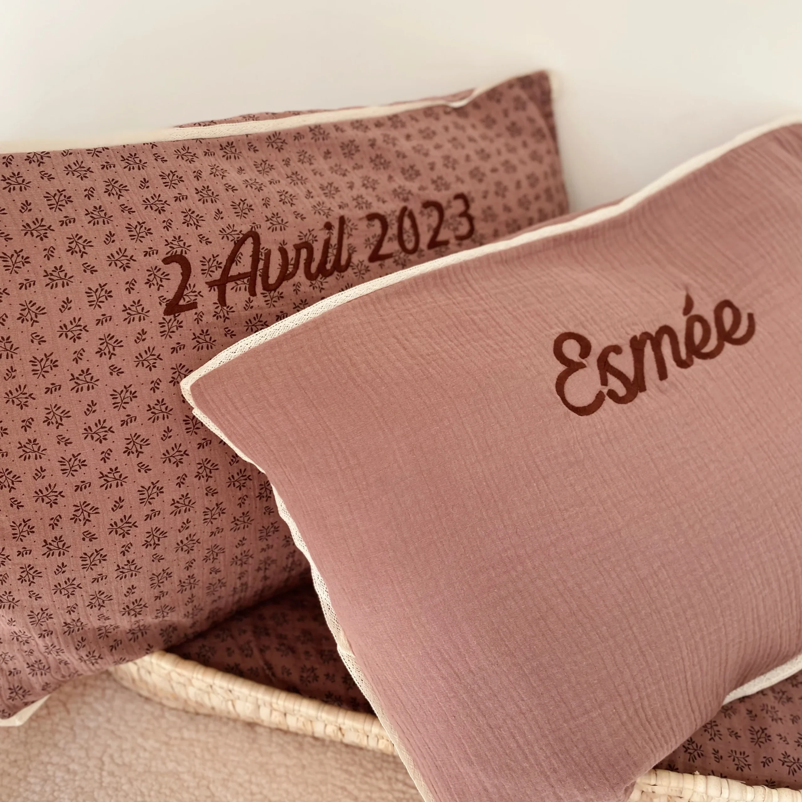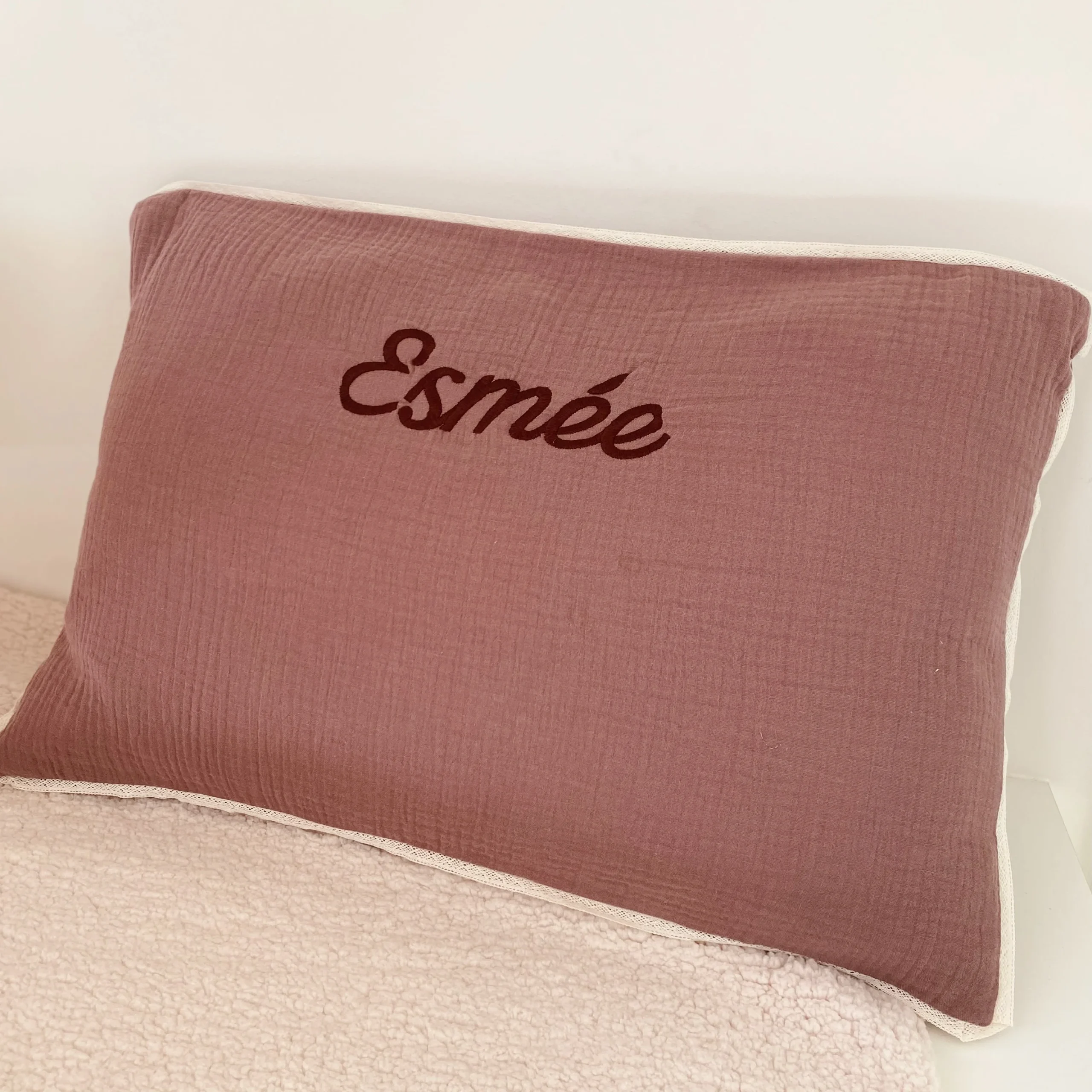 Coussin personnalisé en double gaze de coton, 60x40cm, avec un joli liseré de dentelle. Notre garnissage est également fabriqué en France à Lille