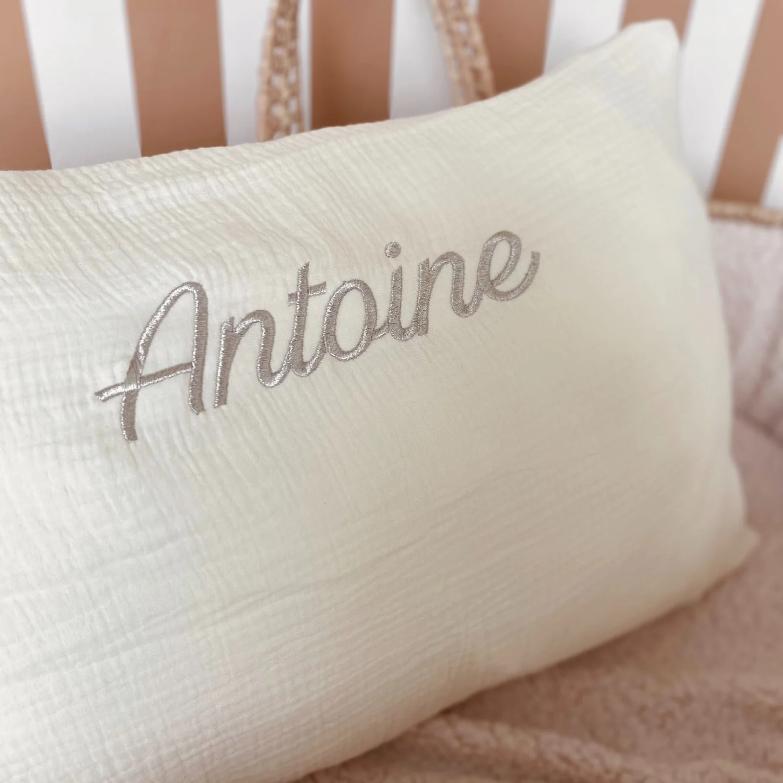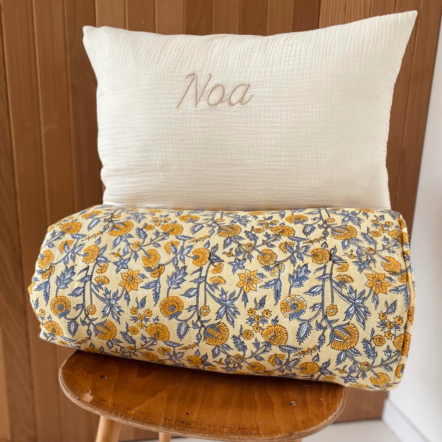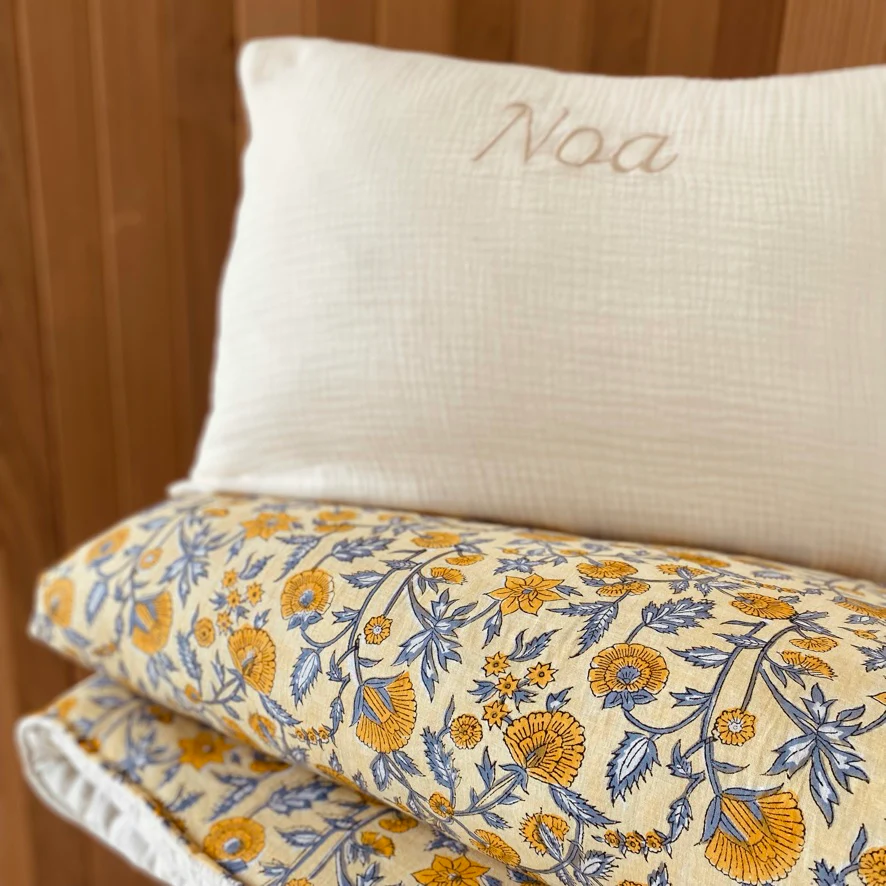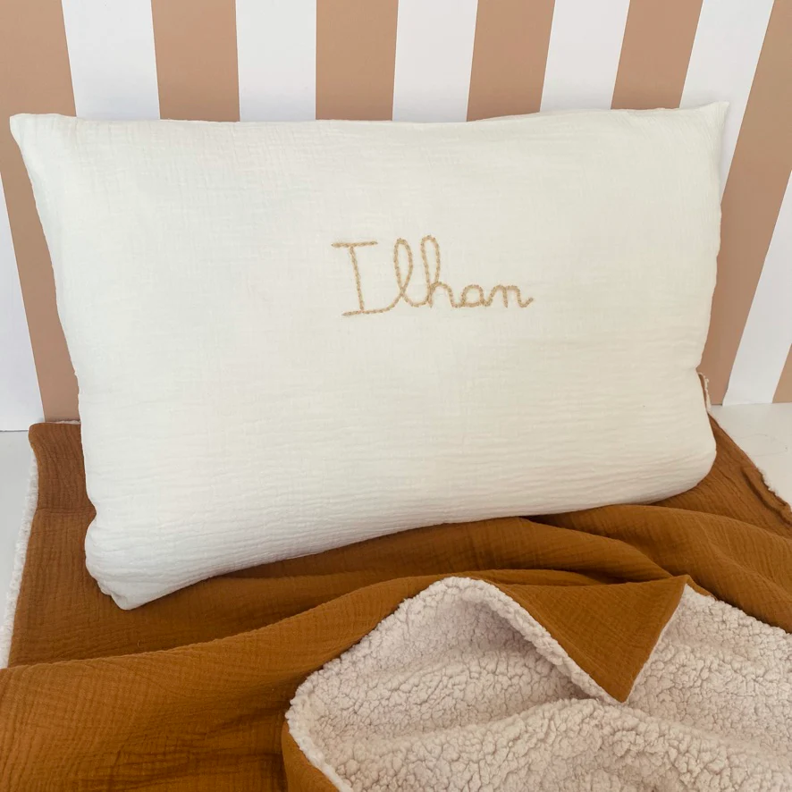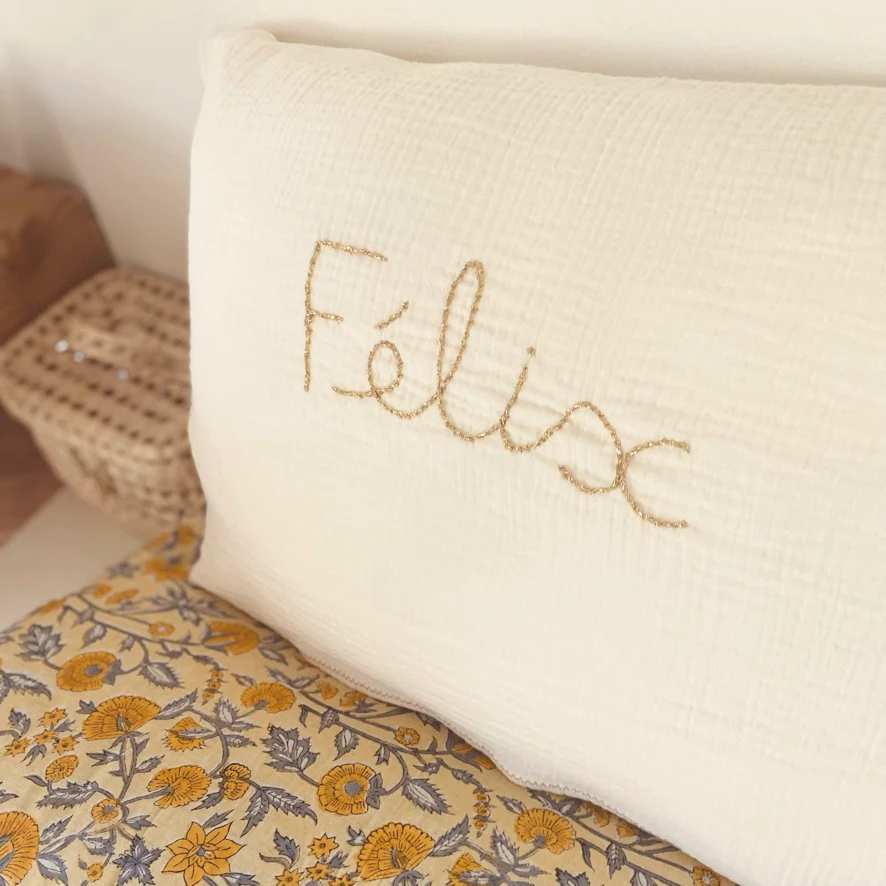 Coussin personnalisé en double gaze de coton, 60x40cm. Notre garnissage est également fabriqué en France à Lille