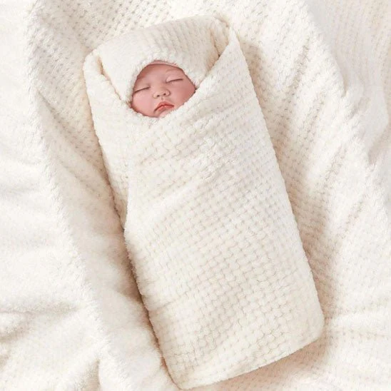 Un bébé est enveloppé dans la Couverture Bébé | SofaThick™ couleur crème, posée sur une surface assortie. Un insert met en valeur sa texture gaufrée et son motif tourbillonnant, soulignant la Douceur Ultime de cette couverture ultra-douce pour votre tout-petit.