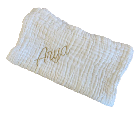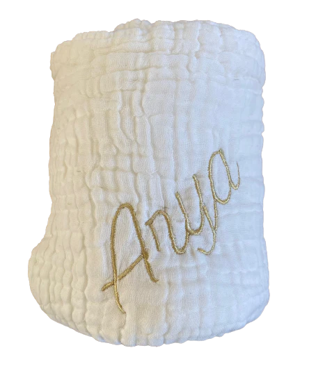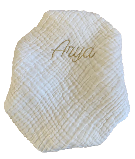 Cette couverture brodée est neuve, et du fond de notre atelier, elle attend juste d’être adoptée par une petite « Arya » 🙂 Couverture moelleuse en triple gaze de coton. Dans un berceau, sur un fauteuil, en promenade ou en sortant du bain, elle garde les petits bien au chaud grâce à ses 6 couches de gaze […]