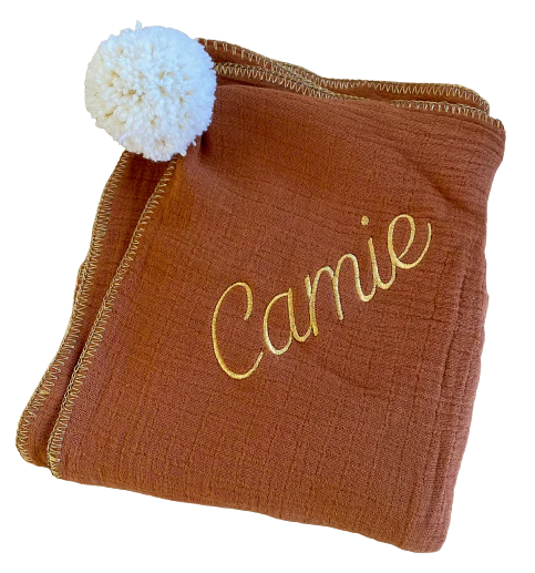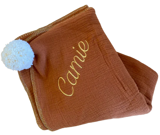 Couverture en triple gaze de coton texturée, ornée d’un pompon de laine amovible et d’une jolie surpiqure dorée.