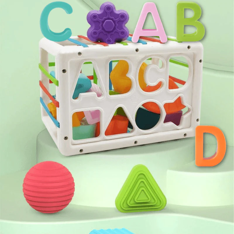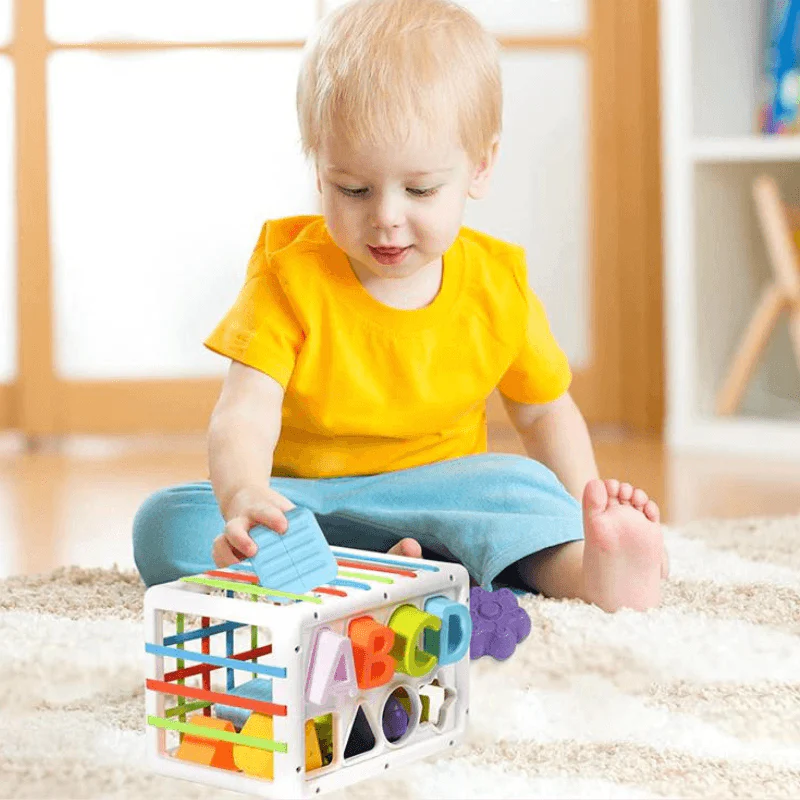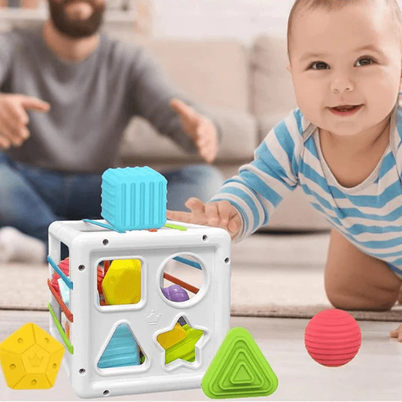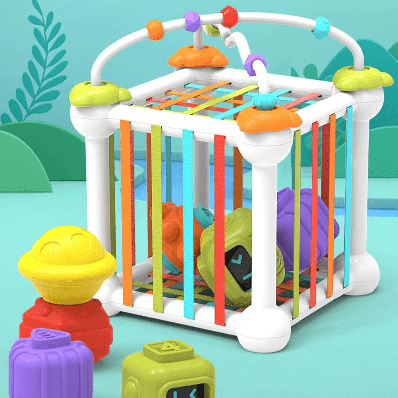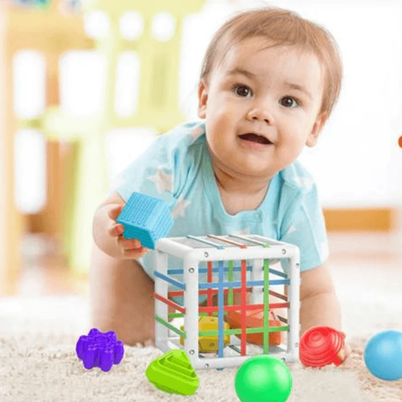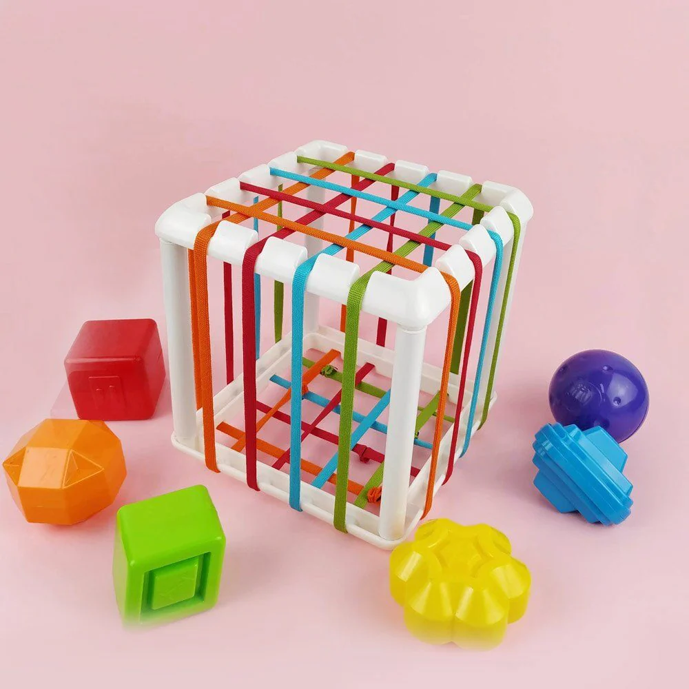 Instinctivement et naturellement Bébé va prendre les différentes formes d’objets pour les pousser dans le cube à travers les élastiques