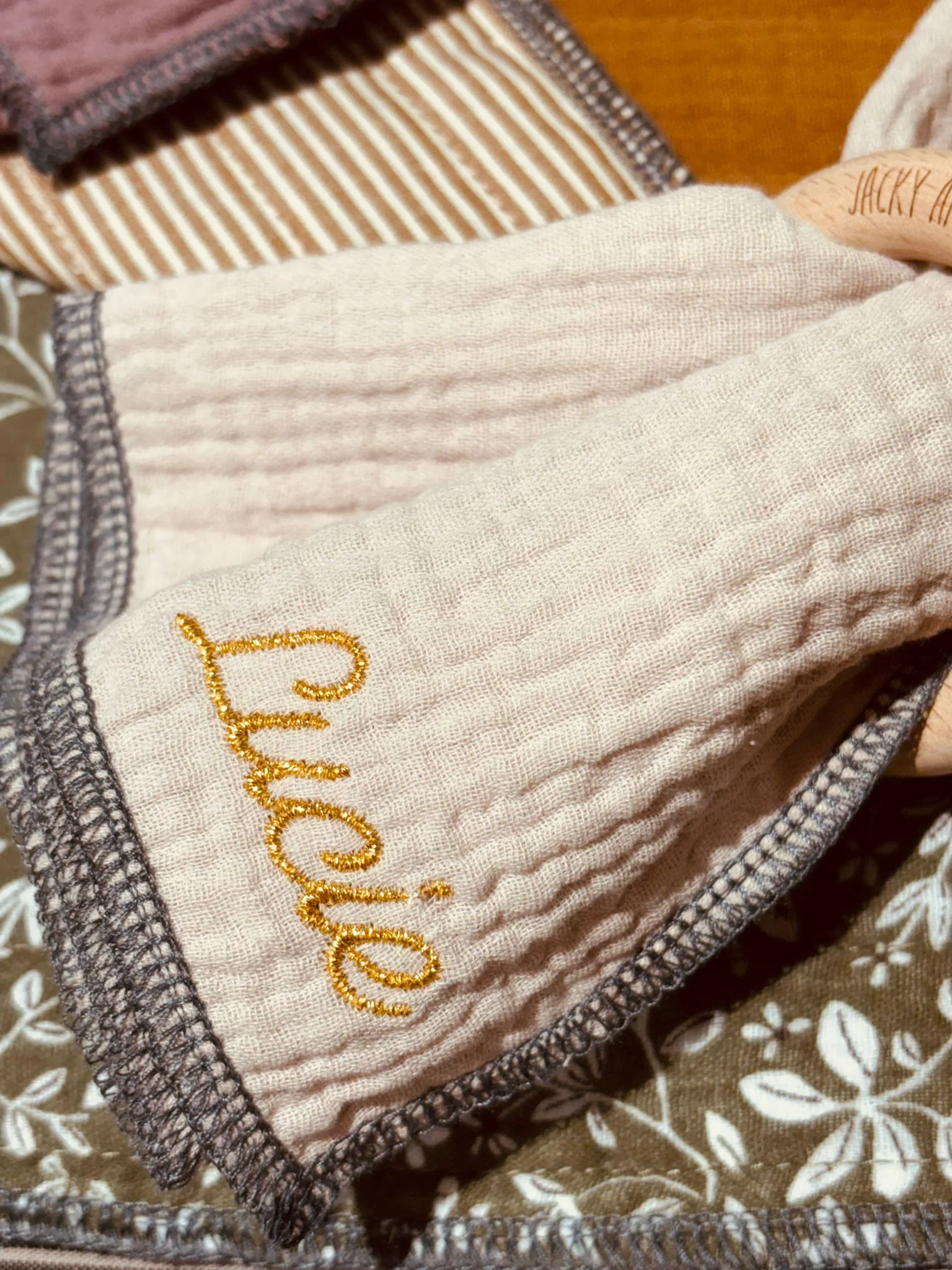 Nous brodons le prénom ou le mot de votre choix, vous pourrez nous l’indiquer au moment du passage de la commande dans l’espace prévu 🙂