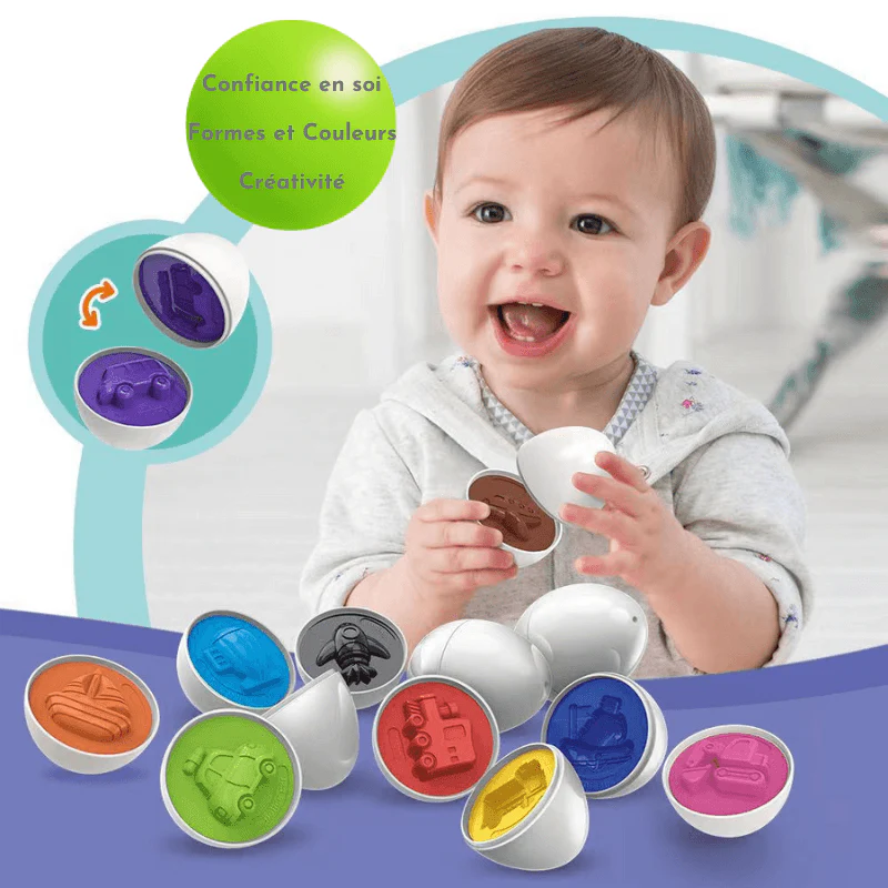 Instinctivement et naturellement Bébé va prendre les 2 moitiés d’oeuf pour tenter de les assembler.