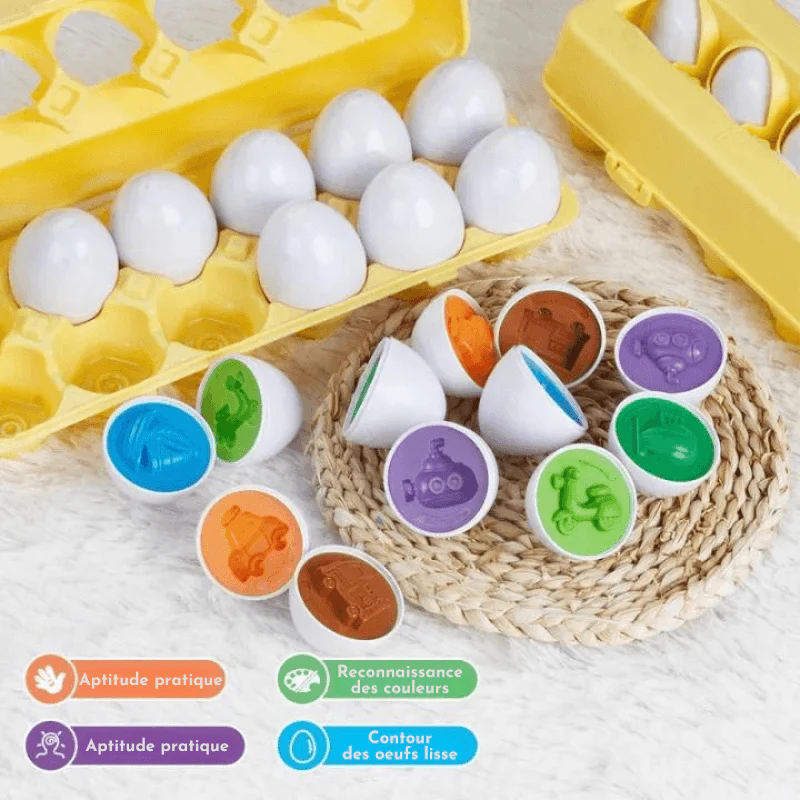 Il apprend seul en s’amusant à faire la différence avec les différentes formes à l’intérieurs des oeufs.
