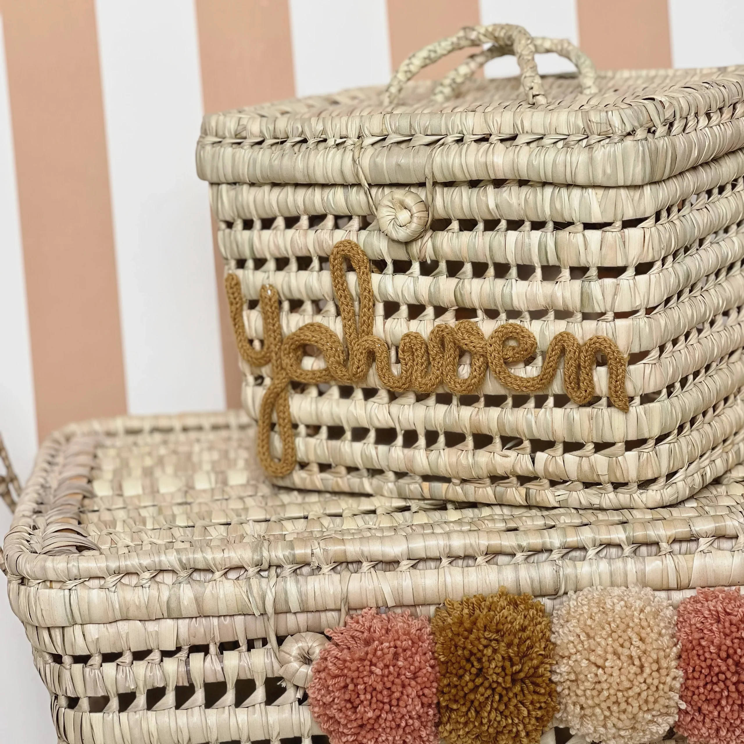 Issues de l’artisanat marocain, cette jolie vannerie en palme s’accorde à merveille à nos couffins, nos coffres etc …