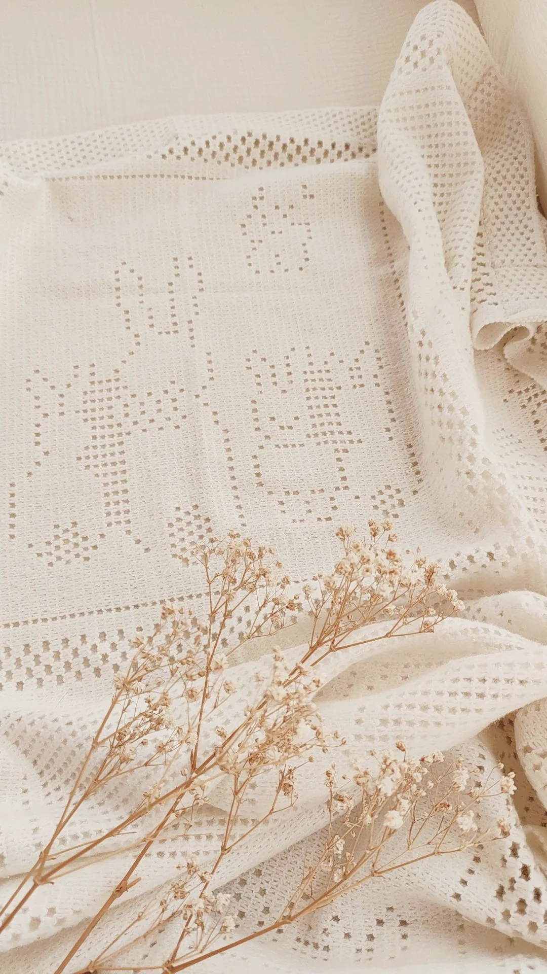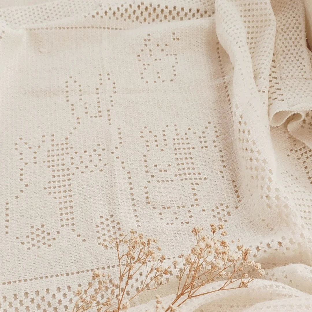 Voici une jolie grande couverture réversible fabriquée à partir d’une maille en coton mélangé très douce, avec des découpes délicates en forme de lapins et papillons.