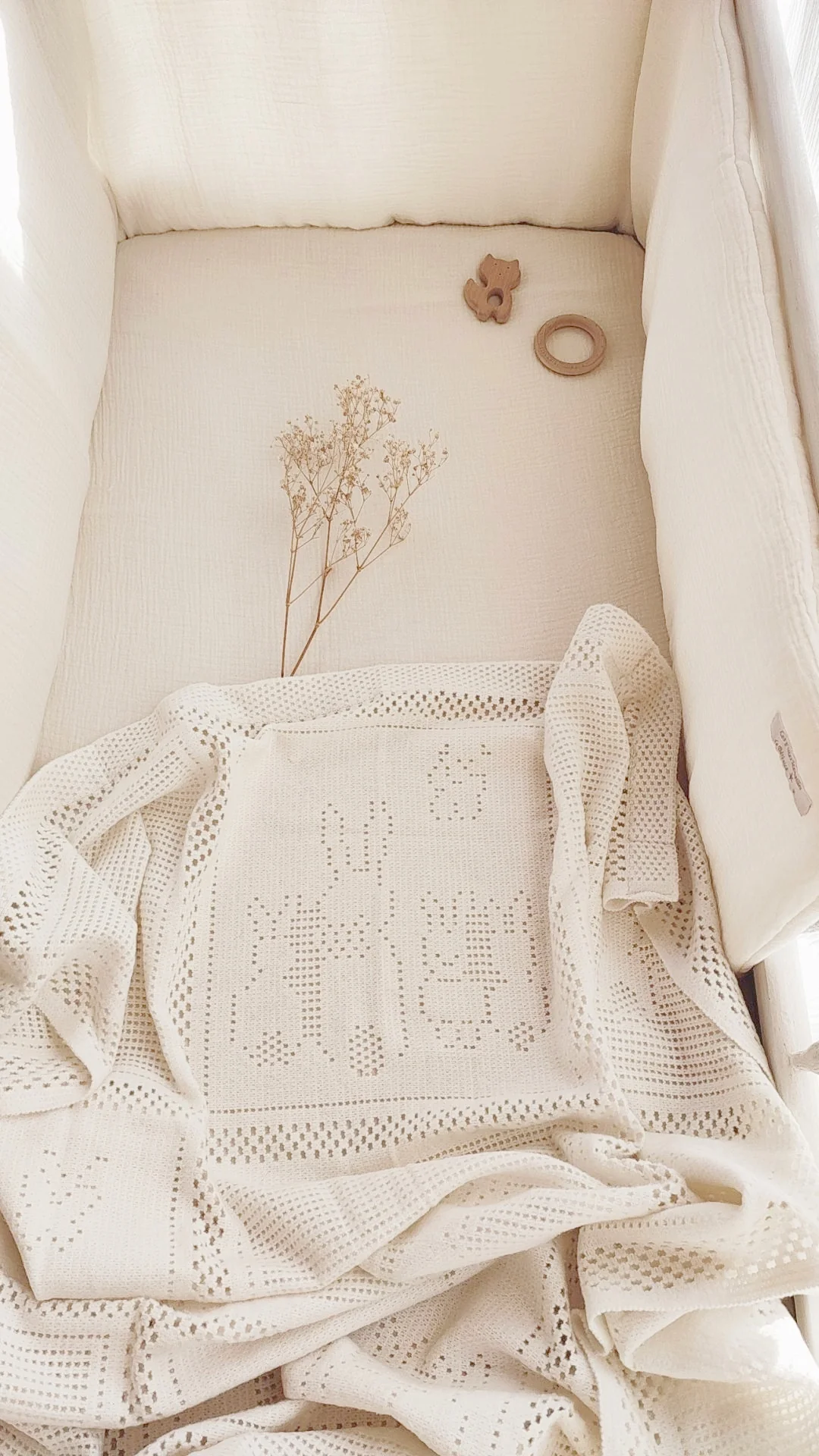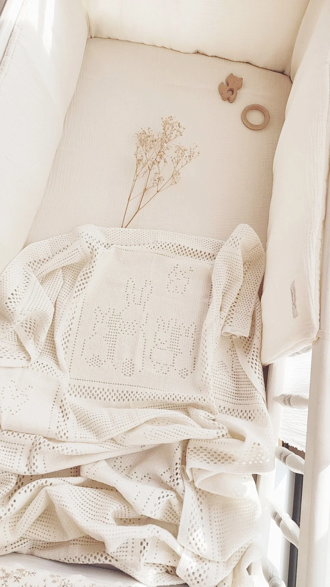 Grande couverture douce légère et chaude pour bébé « La famille lapins » ajourée en coton écru