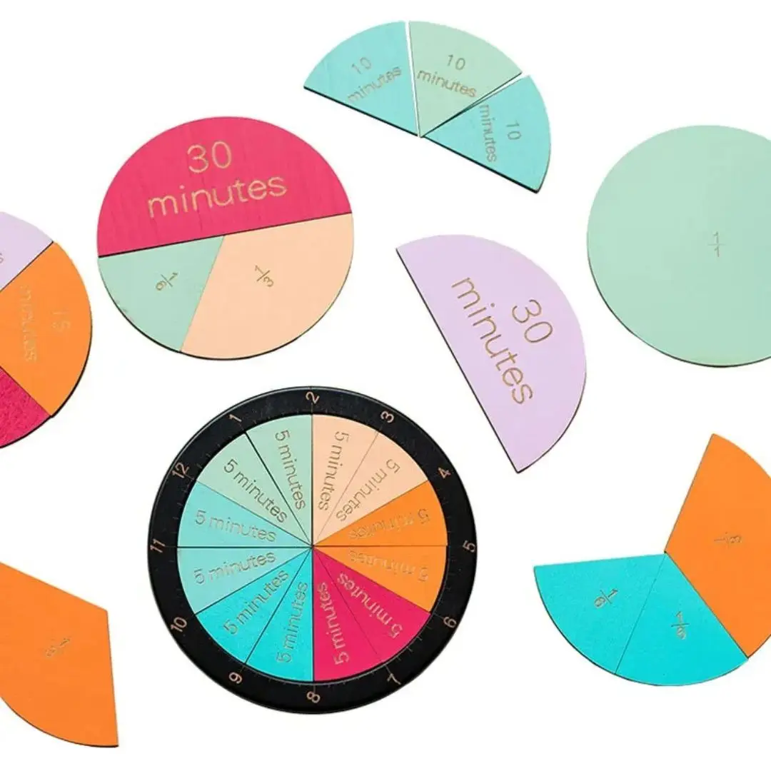 📚 En combinant des exemples de la vie quotidienne et un apprentissage pratique, l’horloge éducative fractionnaire permet aux enfants de comprendre les fractions comme des parties d’un tout.