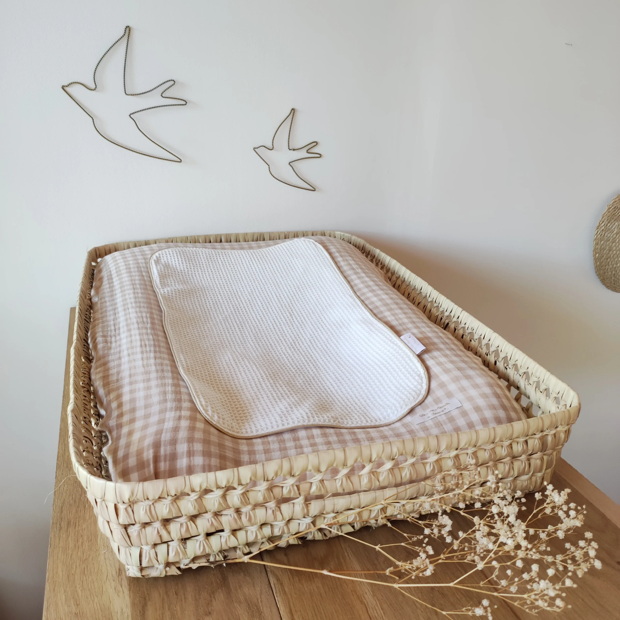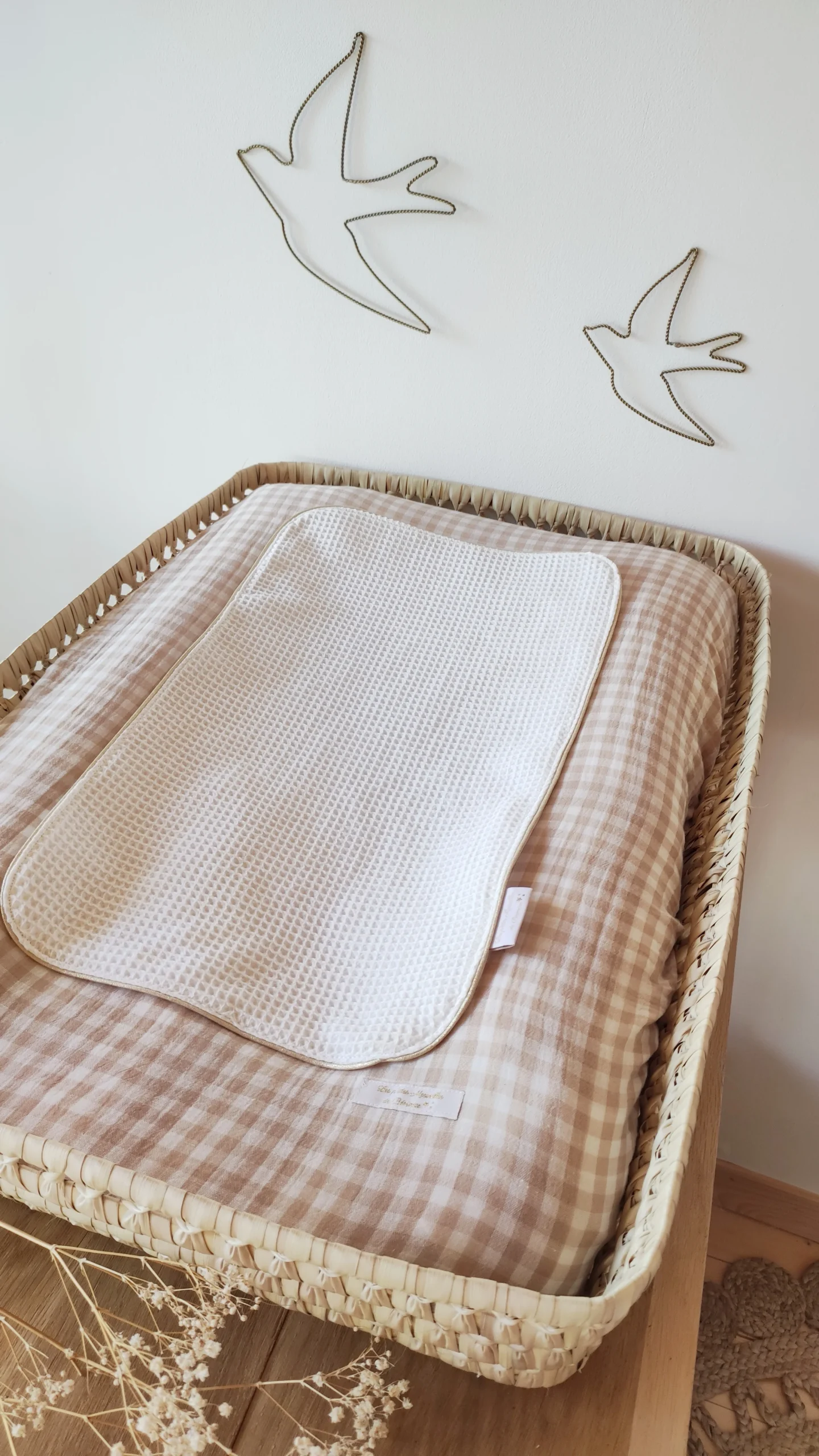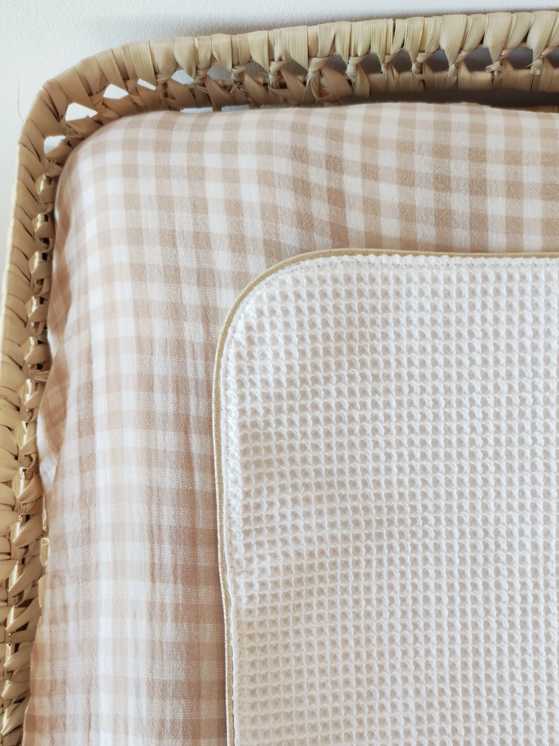 Housse de matelas à langer en double gaze de coton vichy beige et blanc cassé