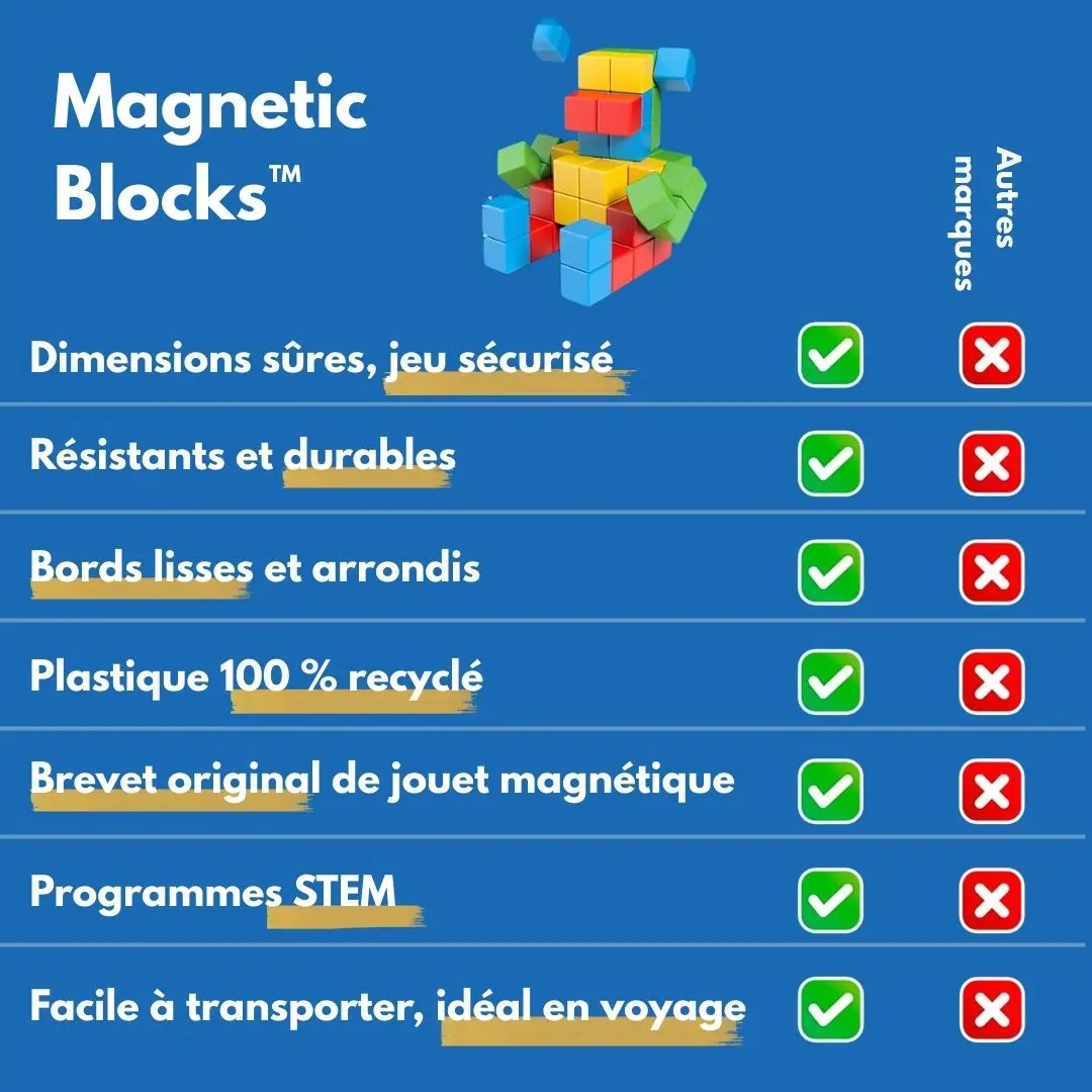 Laissez place à la créativité avec Magnetic Blocks™, le jeu de construction magnétique nouvelle génération. Grâce à leur rotation 360° et à leurs aimants puissants sécurisés, ces blocs colorés permettent aux enfants de 3 à 8+ ans de construire, d’imaginer et d’apprendre en s’amusant.