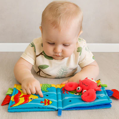 On y trouve un téléphone factice, un cadre pour dessiner, des boutons musicaux lumineux et plusieurs éléments mobiles aux textures variées.