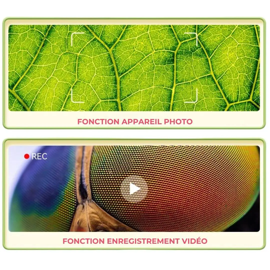Le MicroExplorer™ intègre une fonction photo & vidéo HD, permettant d’immortaliser chaque observation. Avec sa mémoire interne (jusqu’à 400 photos) et la possibilité d’ajouter une carte SD, les jeunes scientifiques peuvent conserver leurs découvertes et les partager.