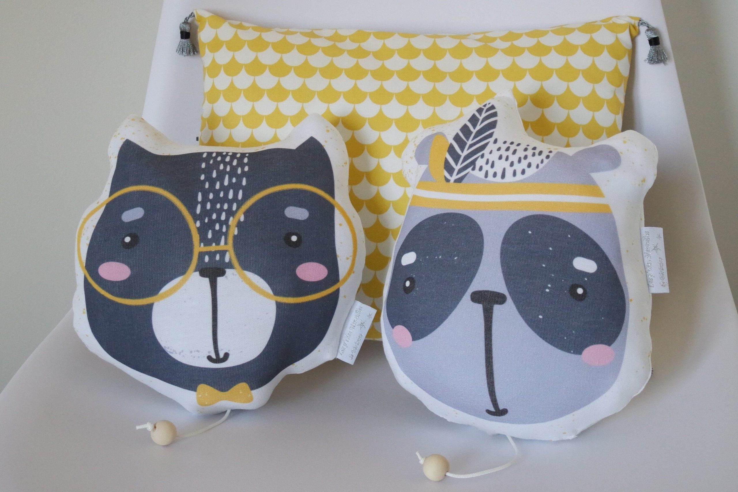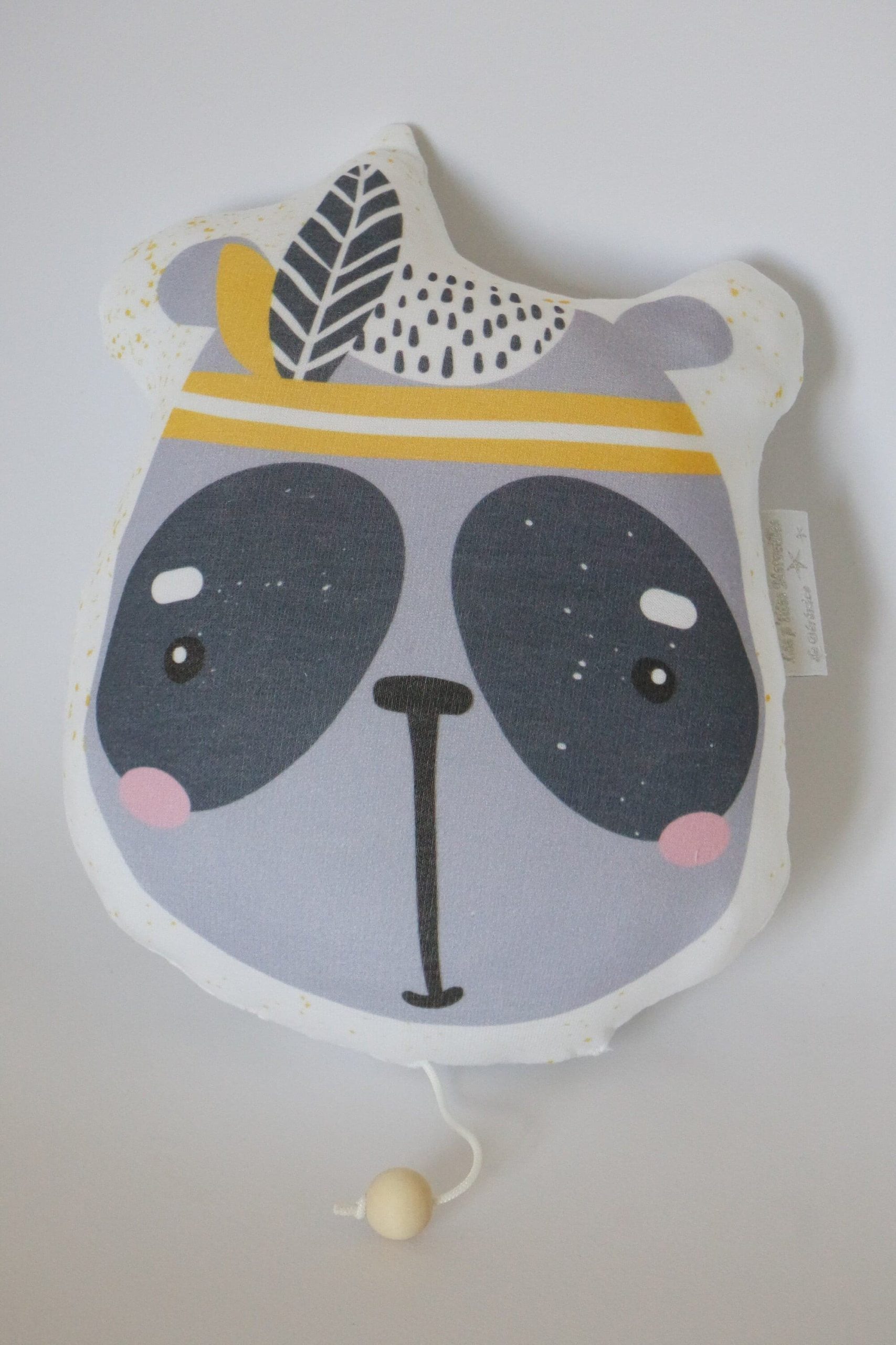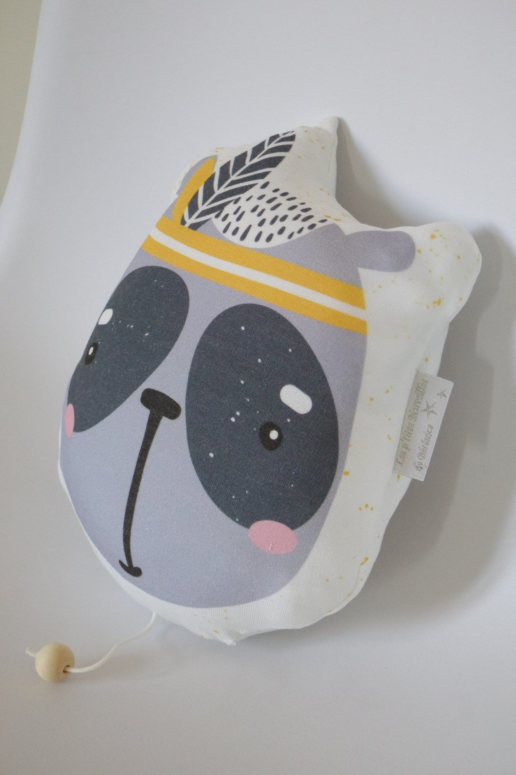 Ce petit panda mignon avec sa coiffe d’indien Sioux dans les tons gris, jaune et blanc apportera une touche originale et moderne pleine de gaieté à la déco de la chambre de bébé.