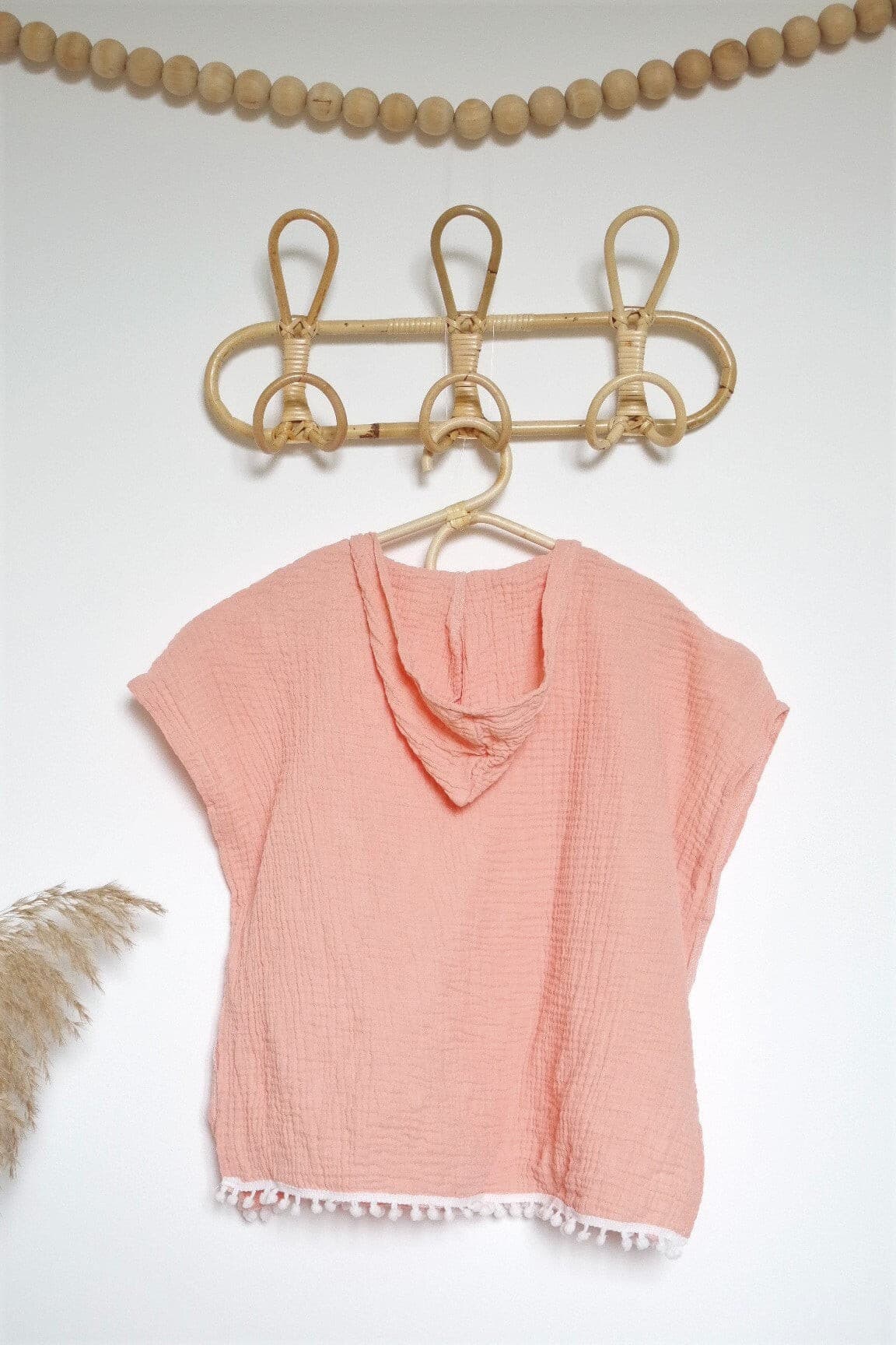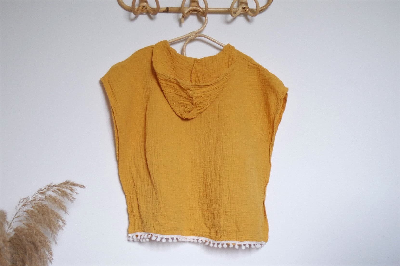 Un magnifique look bohème pour ce très joli poncho à capuche en double gaze de coton toute douce.