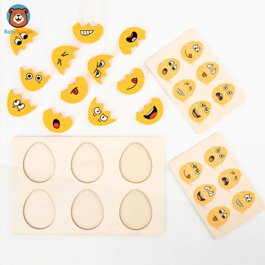 Le but est d’associer les moitiés d’œufs pour former des visages sur la planche en bois, suivant les 15 cartes qui proposent des combinaisons variées.