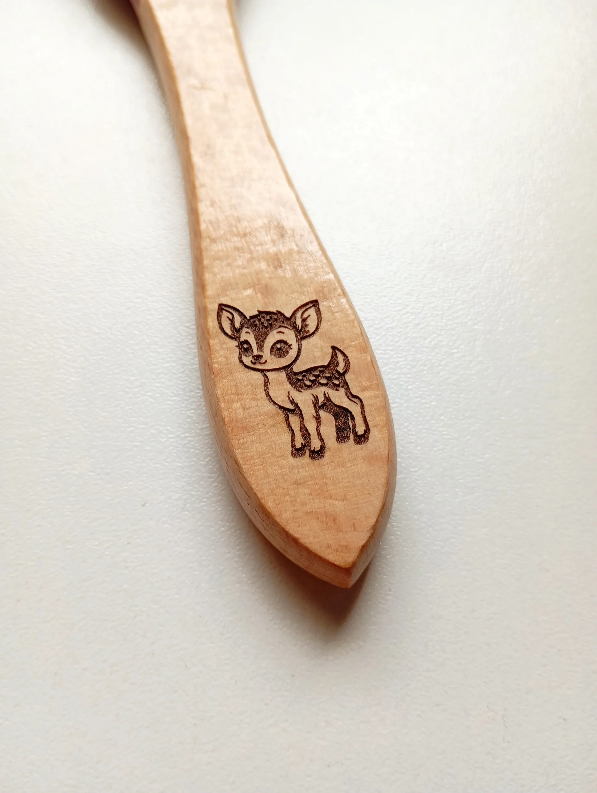 Les couverts personnalisés en silicone et bois permettront à votre petit bout’chou de découvrir la saveur et la texture de chaque aliment.
