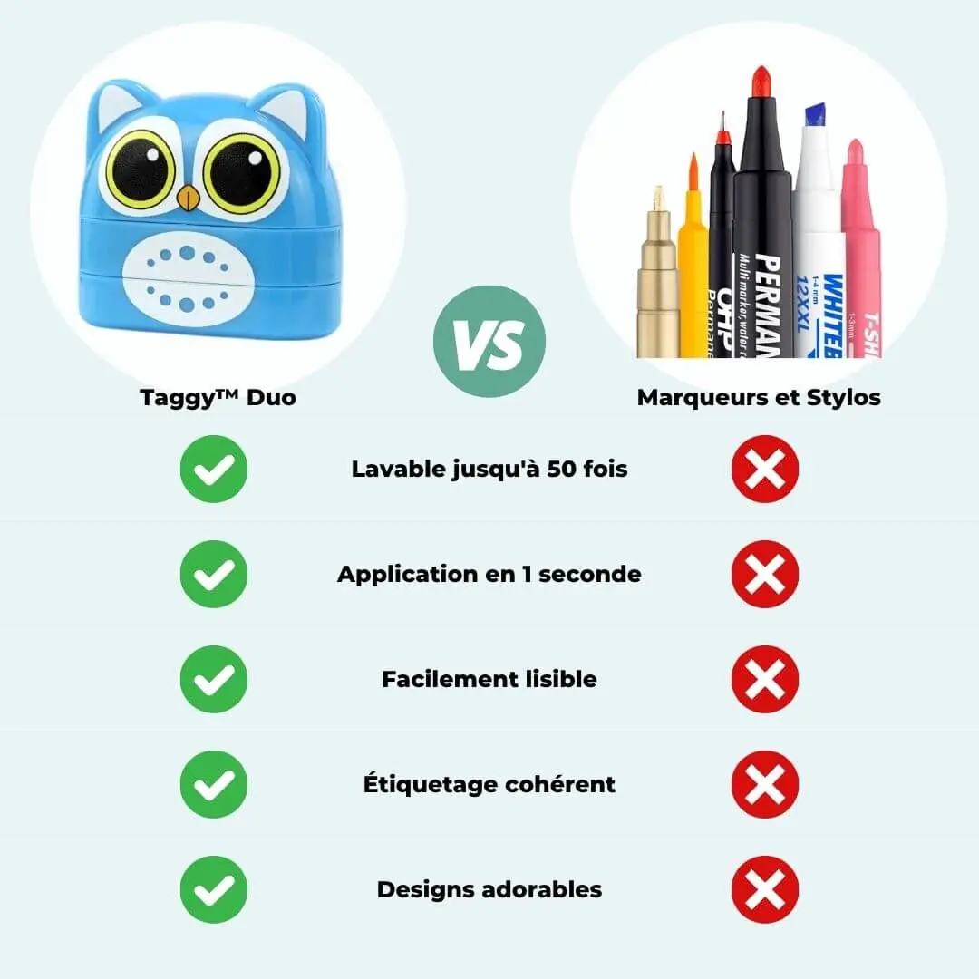 ✅ Avec Taggy™ Duo, tamponnez deux prénoms différents (ou deux designs) sur toutes les affaires de vos enfants grâce à un tampon ingénieux à double empreinte.