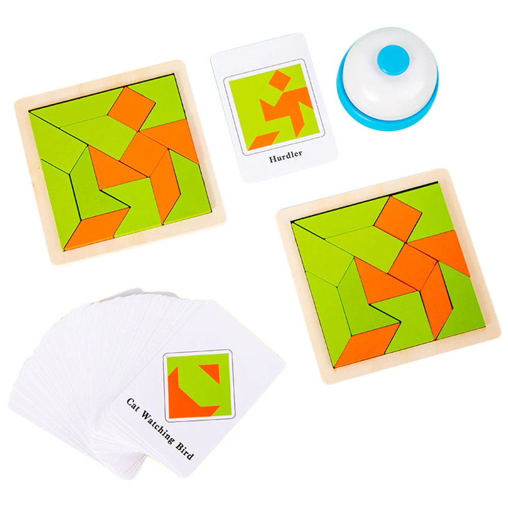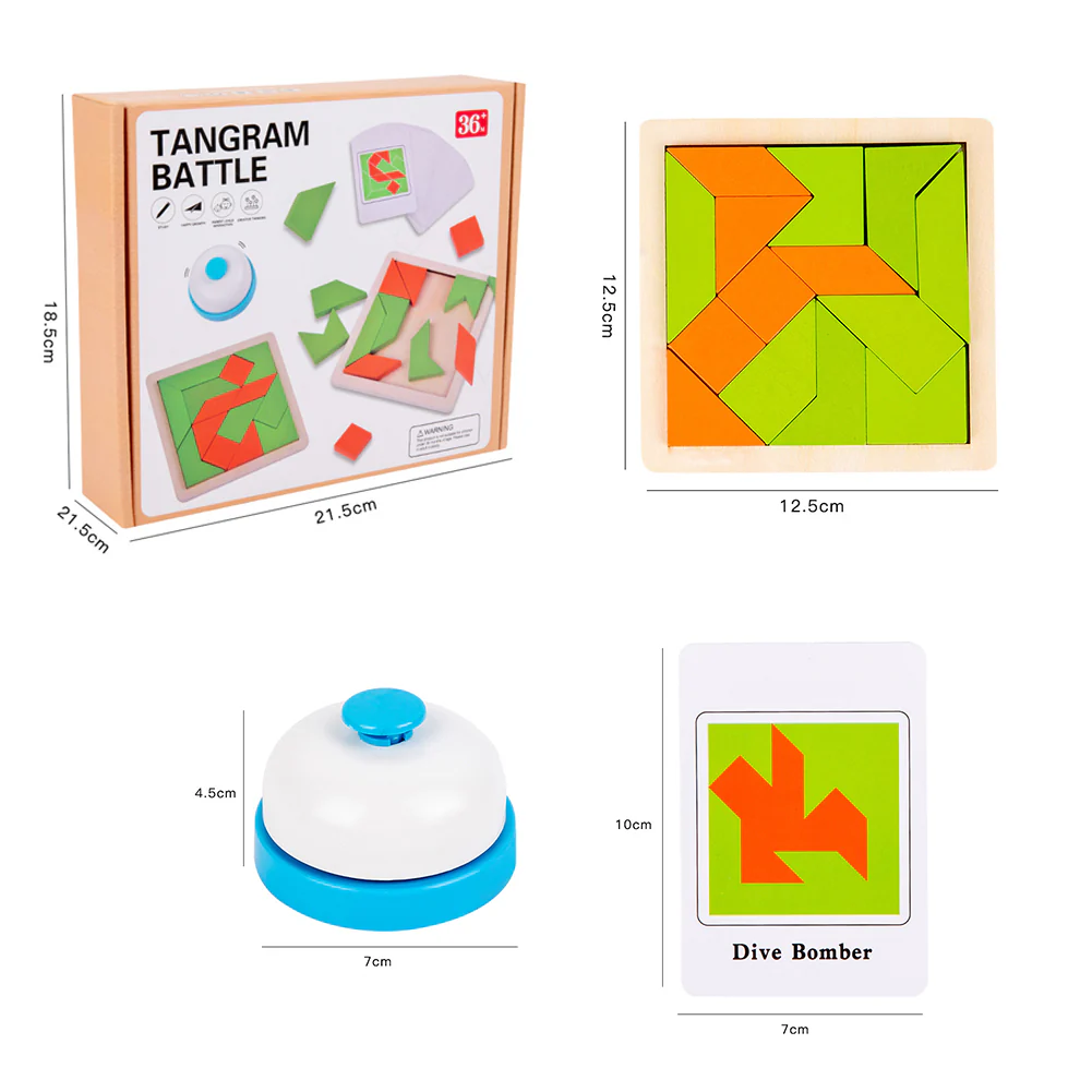 Les règles de TangramBattle sont simples : Chaque joueur a 1 plateau et 14 blocs de formes et couleurs différentes. Un joueur tire une carte du paquet pour révéler un motif. Ensuite, tous les joueurs doivent reproduire le motif affiché sur la carte le plus vite possible et appuyer sur le Buzzer pour gagner la carte!