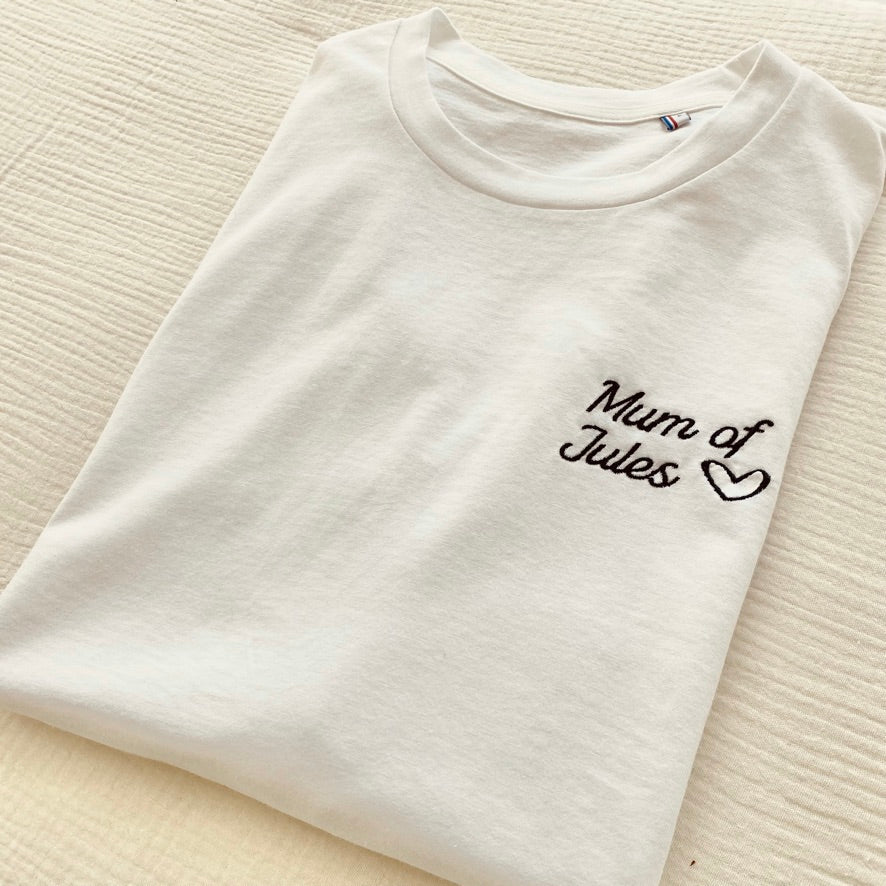 Tee-Shirt blanc oversize marqué d’un mot et d’un petit coeur, à vous de choisir la personnalisation 🙂