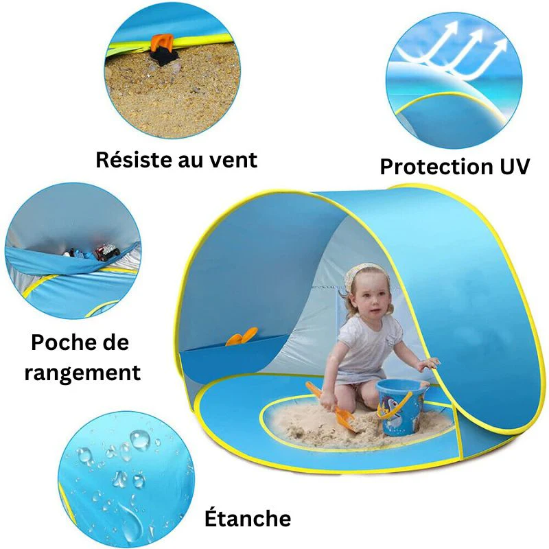 Notre tente de plage bébé assure une protection supérieure contre les rayons UV nocifs du soleil. Le toit en forme d’ombrelle bloque le soleil, permettant à votre bébé de jouer à l’extérieur tout en restant à l’ombre et au frais.