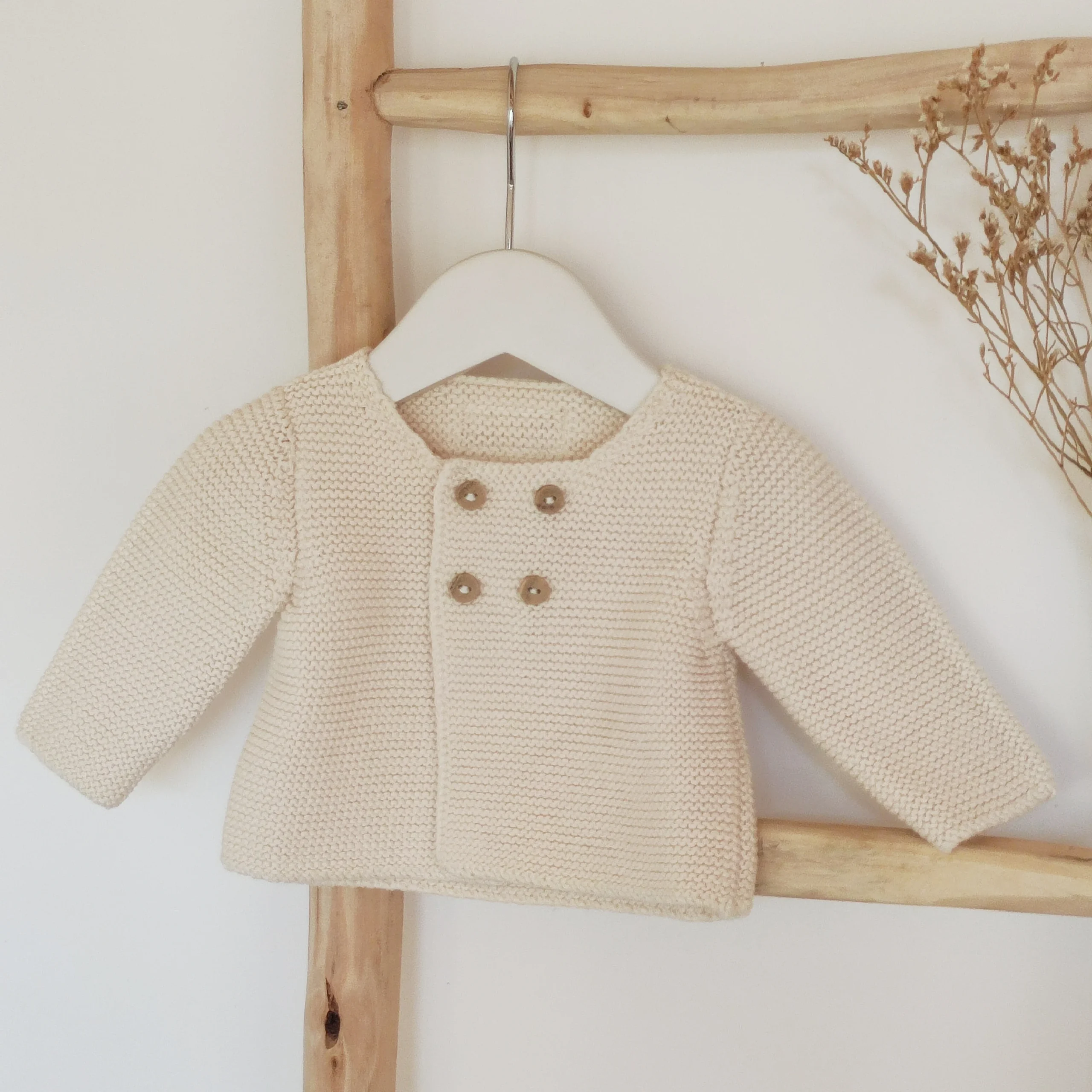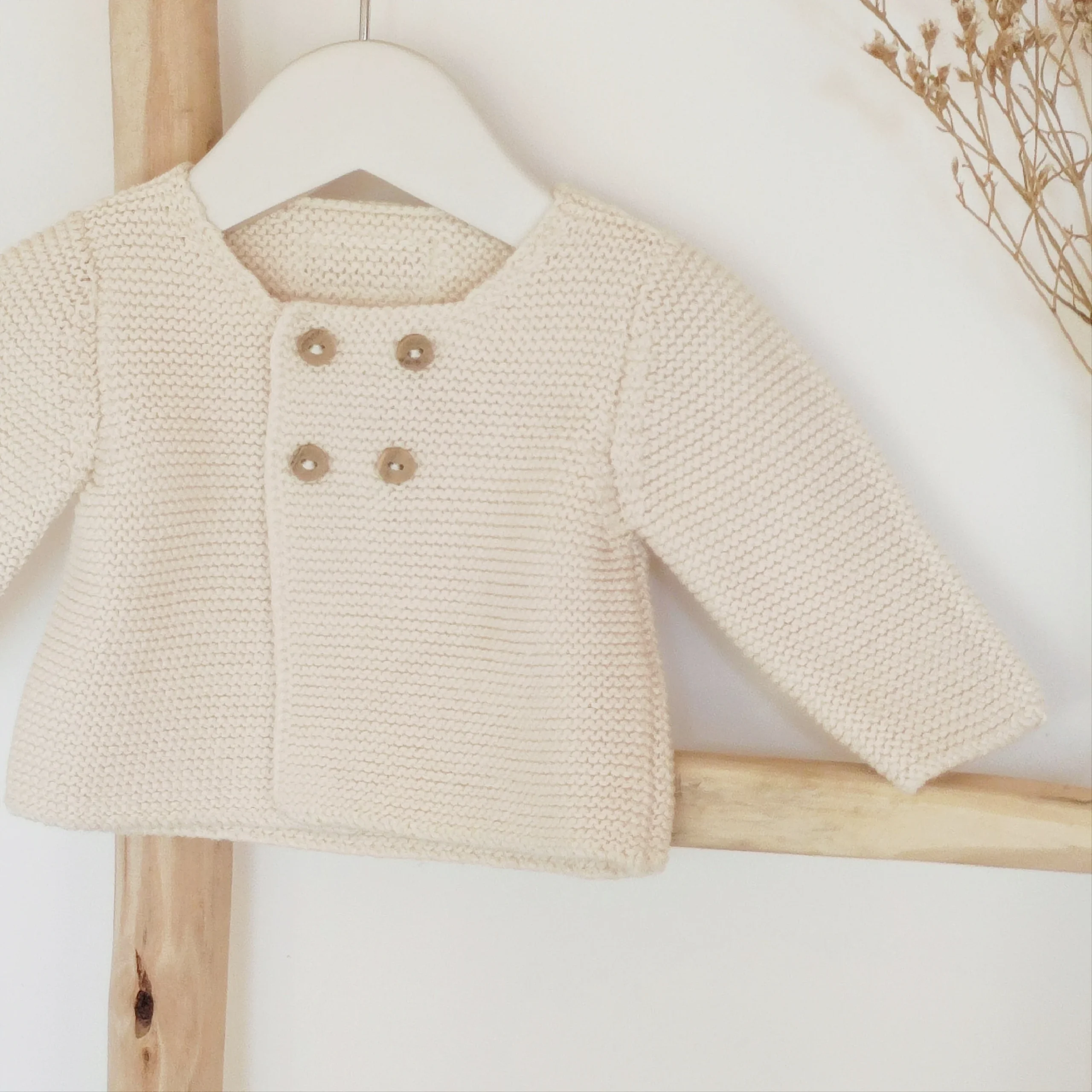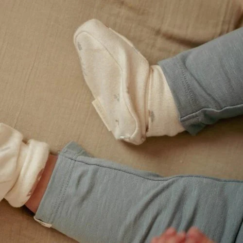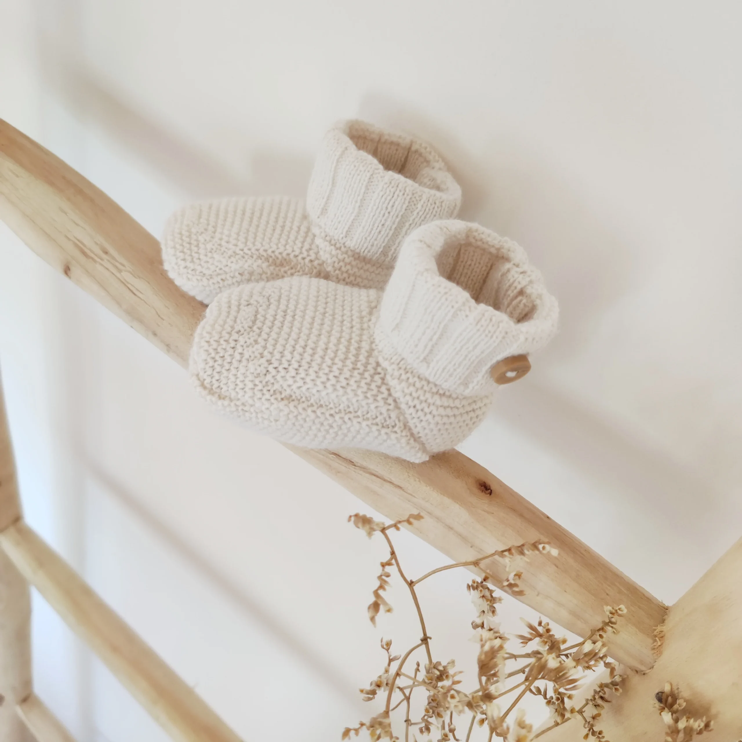 Chaussons bébé mixtes en tricot écru / beige et bouton bois fabriqués en France