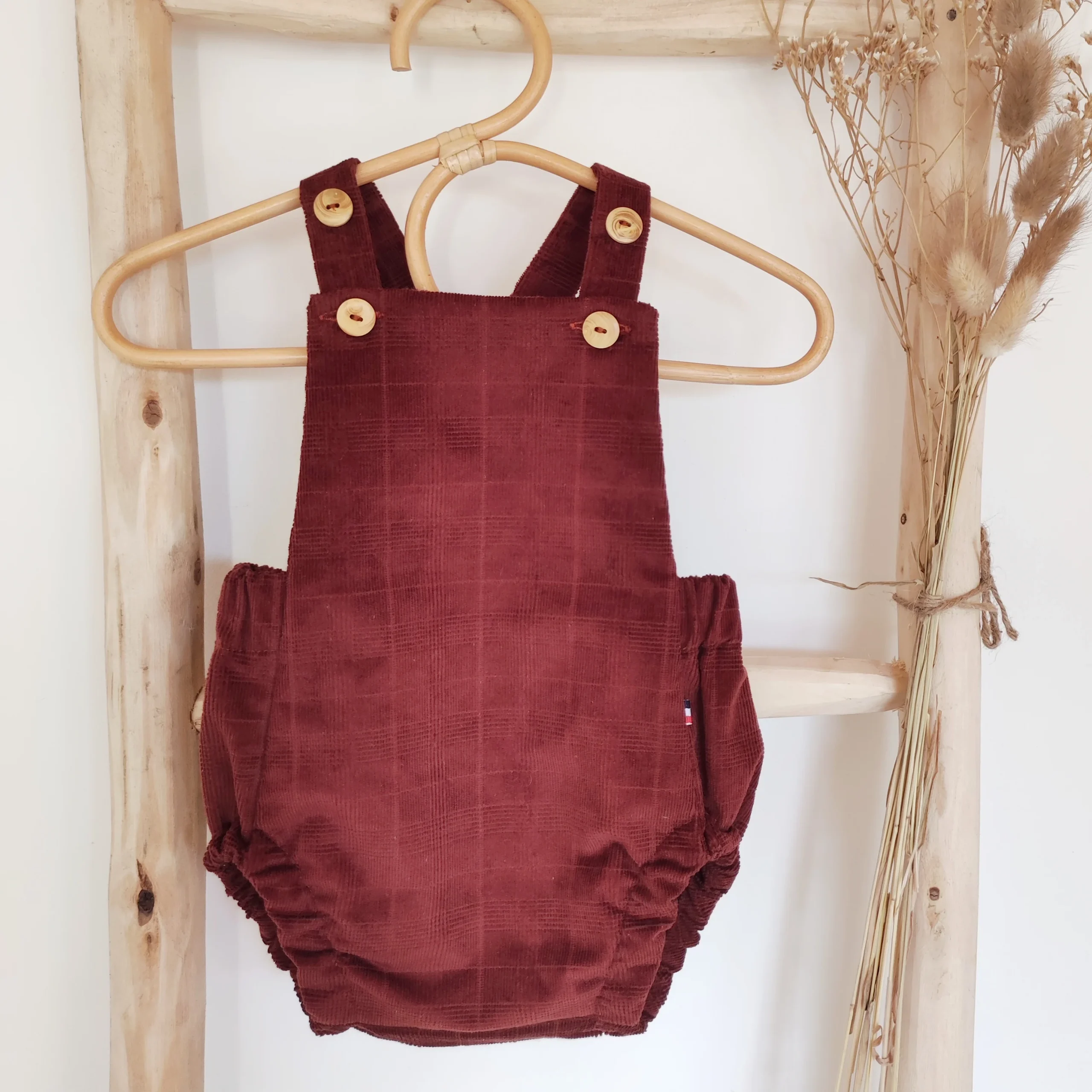 Barboteuse à bretelles bébé « Eden » évolutive en velours à carreaux bordeaux