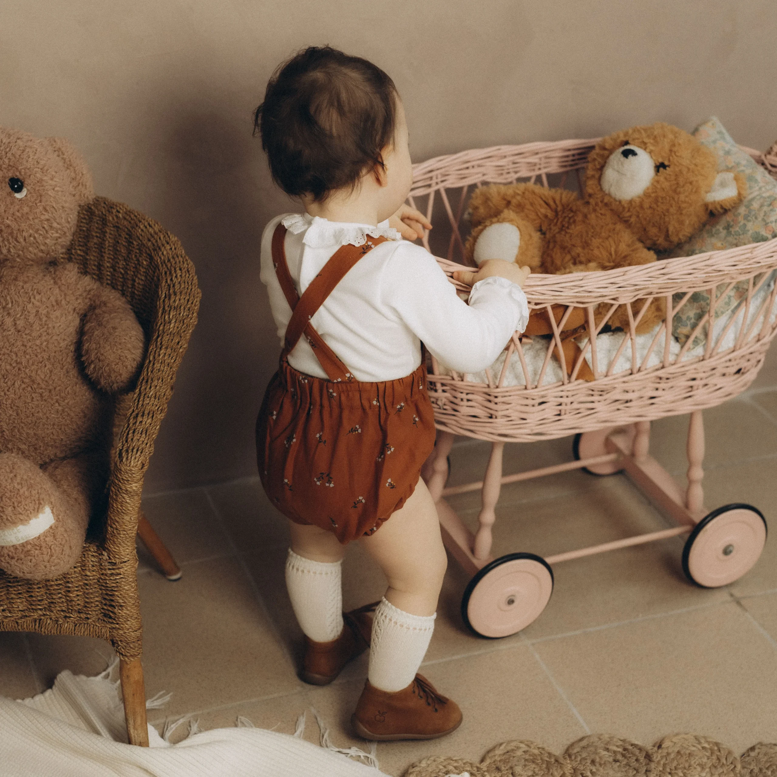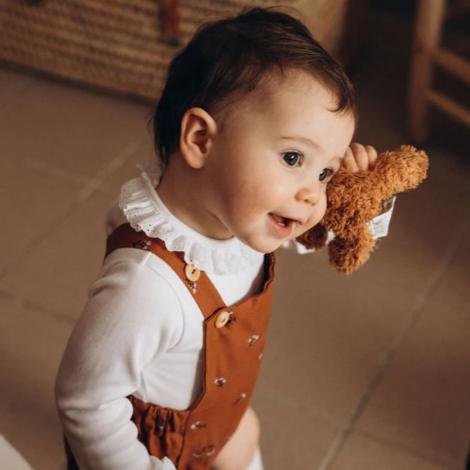 Barboteuse à bretelles bébé « Eden » évolutive en coton BIO rouille à petites fleurs