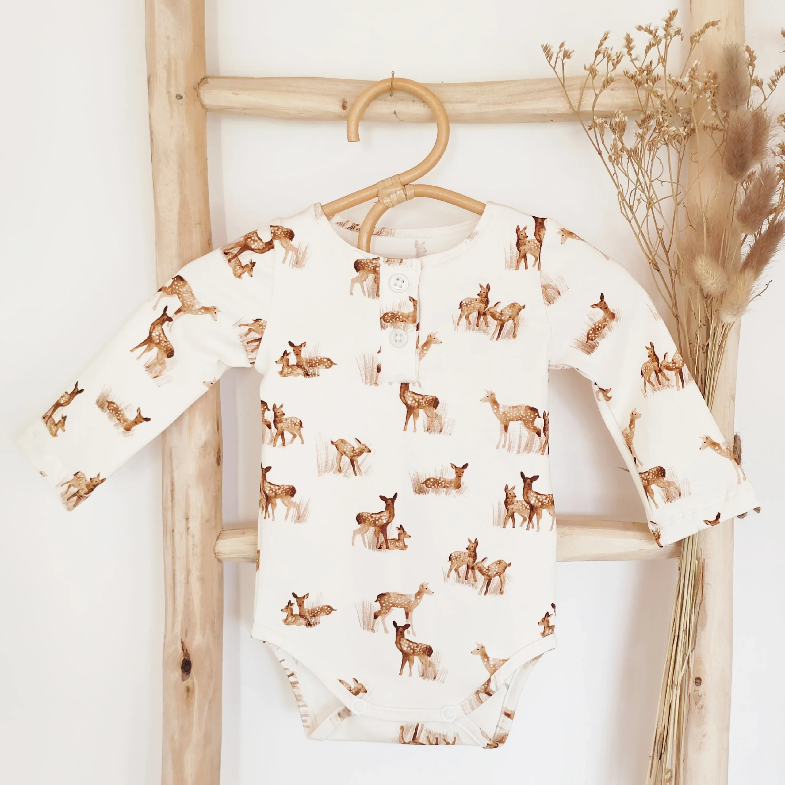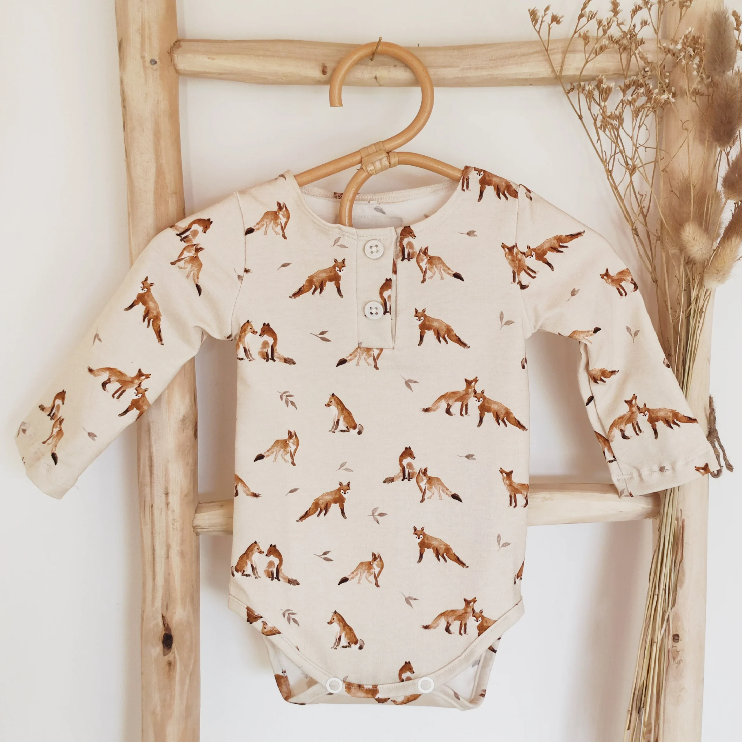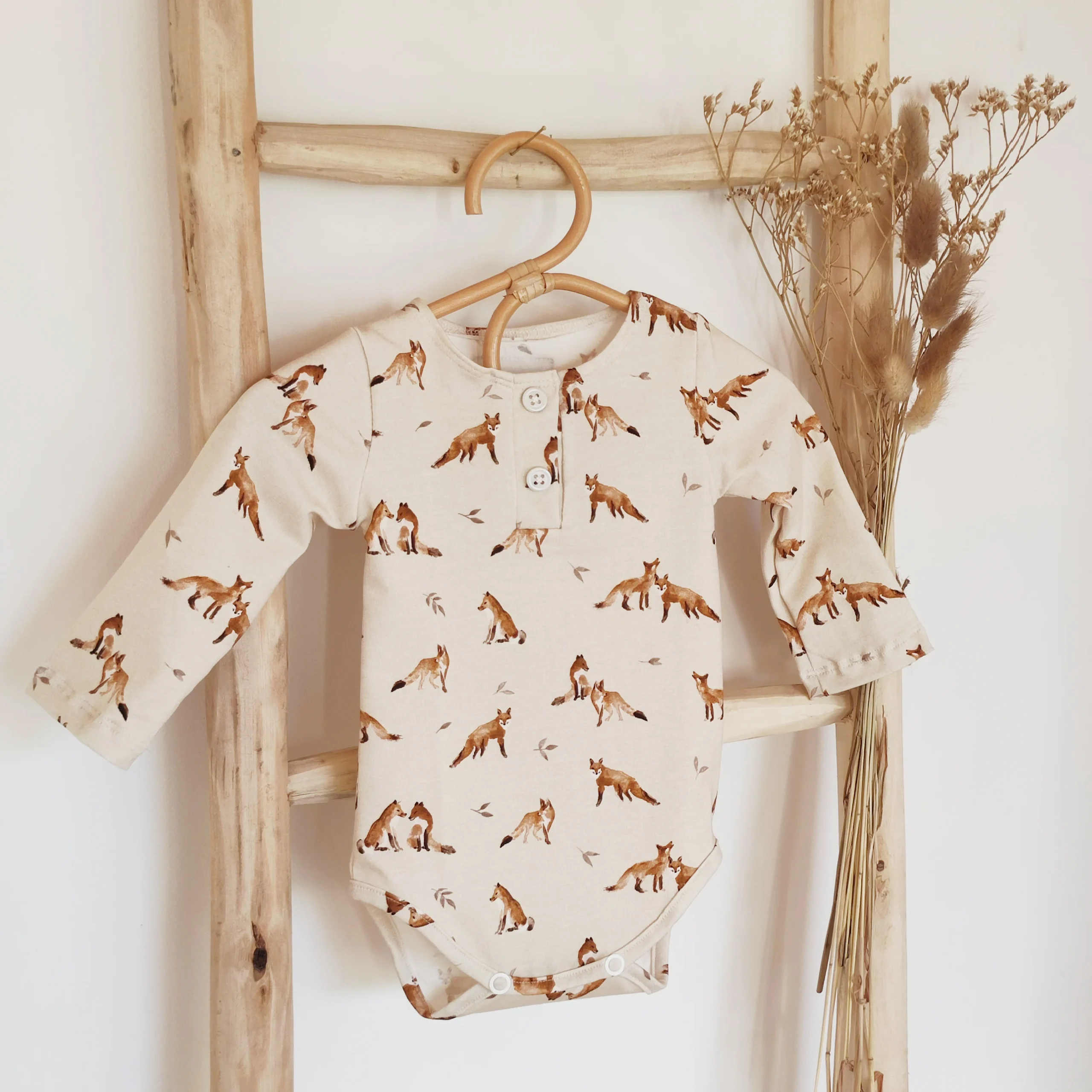 Body bébé « Sacha » à manches longues et col pressionné en jersey de coton soyeux beige lin « Renards »
