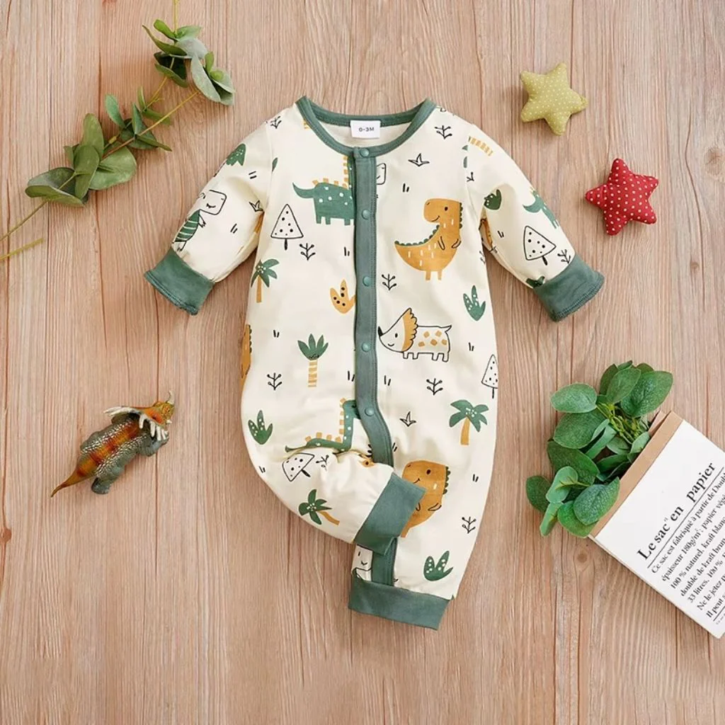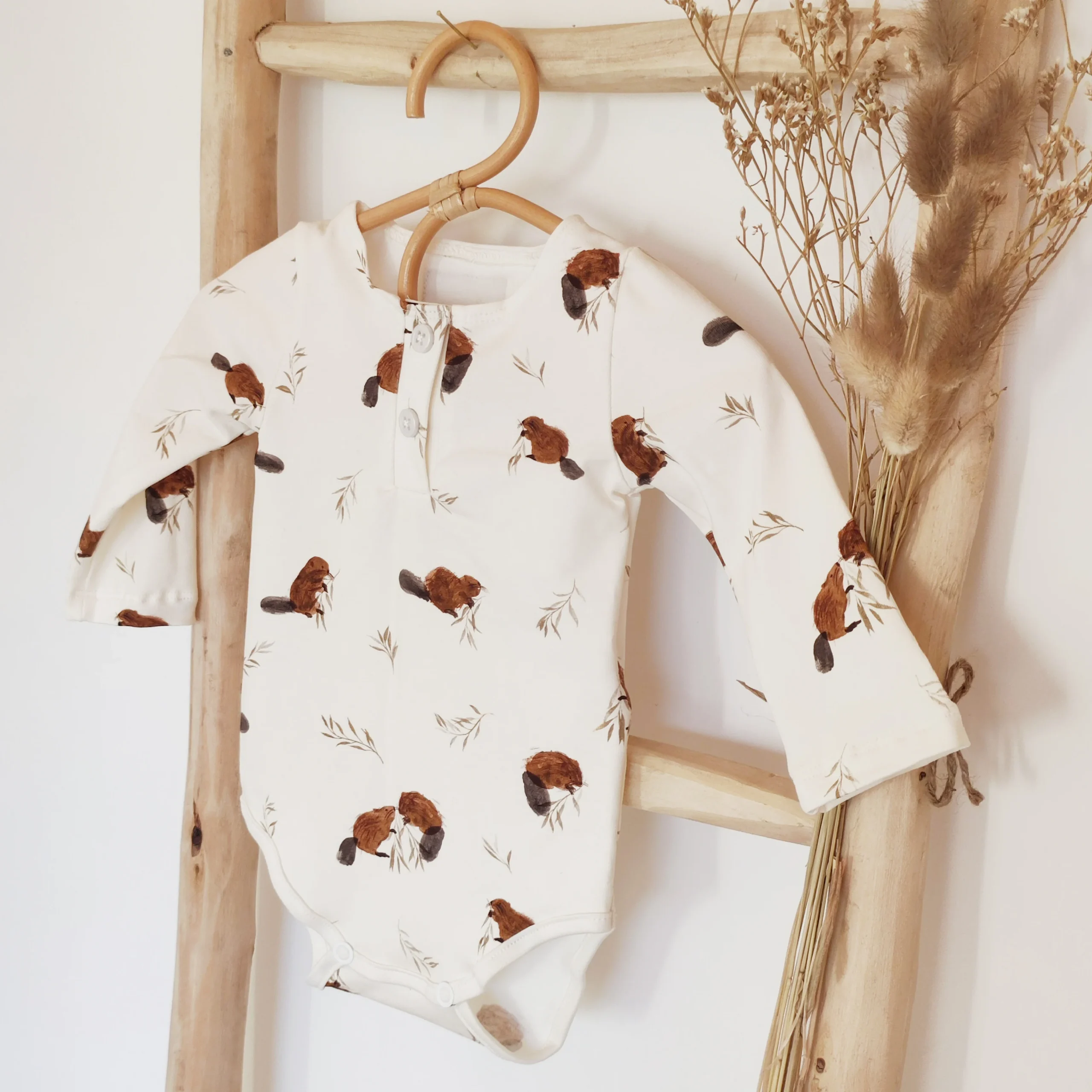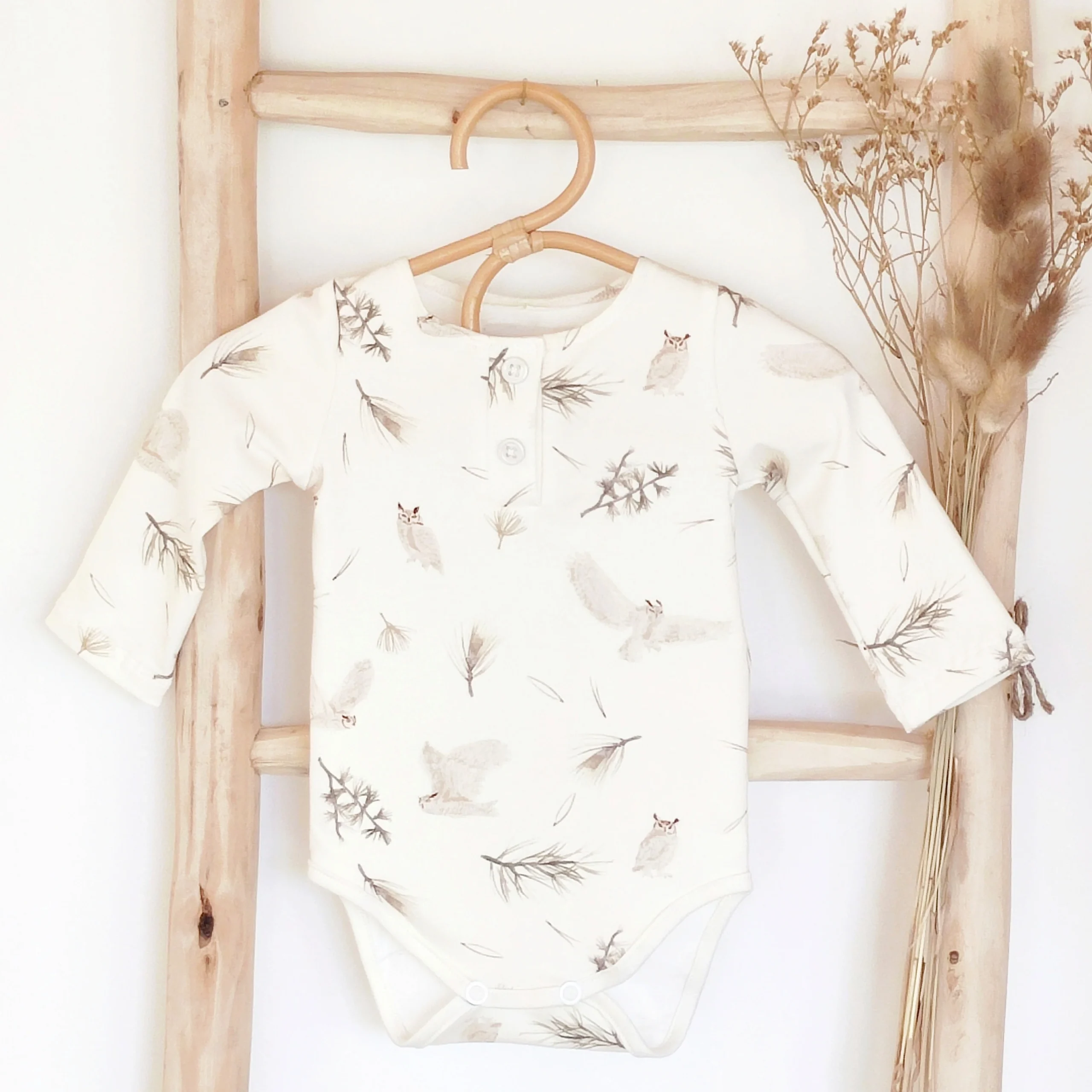 Body bébé « Sacha » à manches longues et col pressionné en jersey de coton soyeux beige lin « Renards »